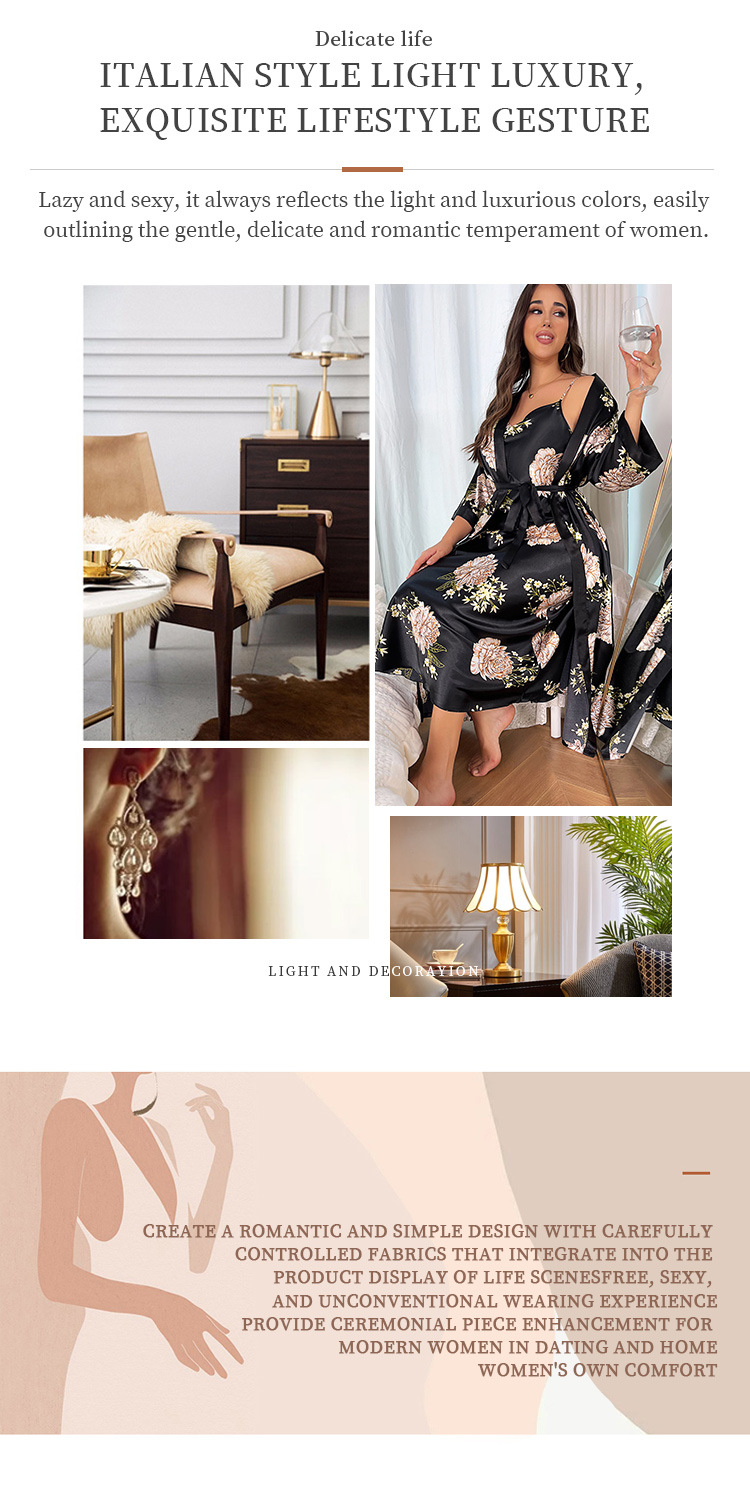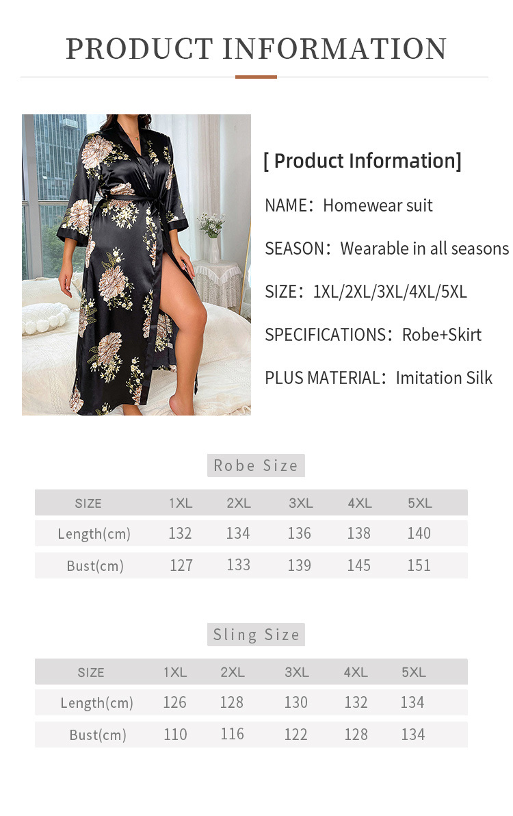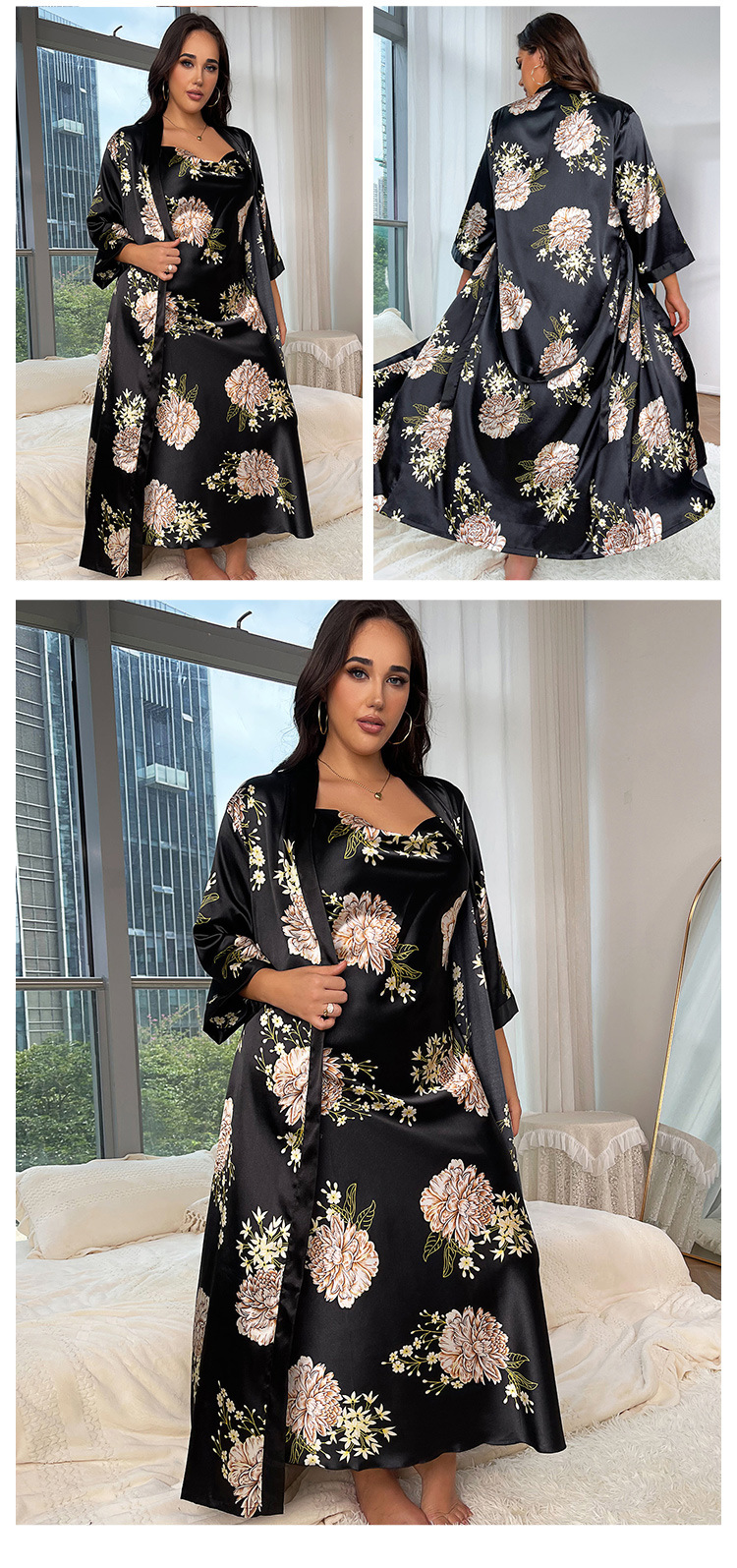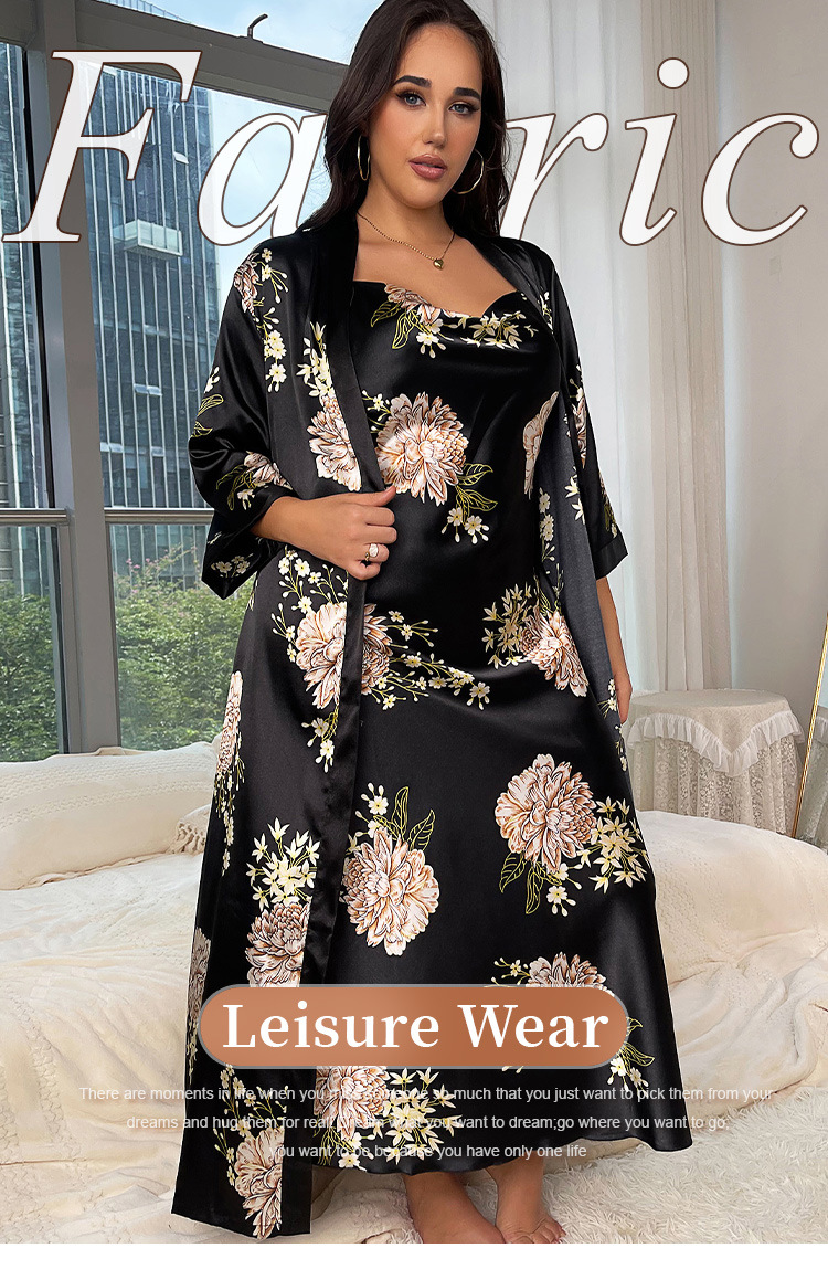 クロスボーダーの大きいサイズの女性用ホームウェア、花柄プリントのサテンナイトガウンとサスペンダースーツ、快適でゆったりとした着心地