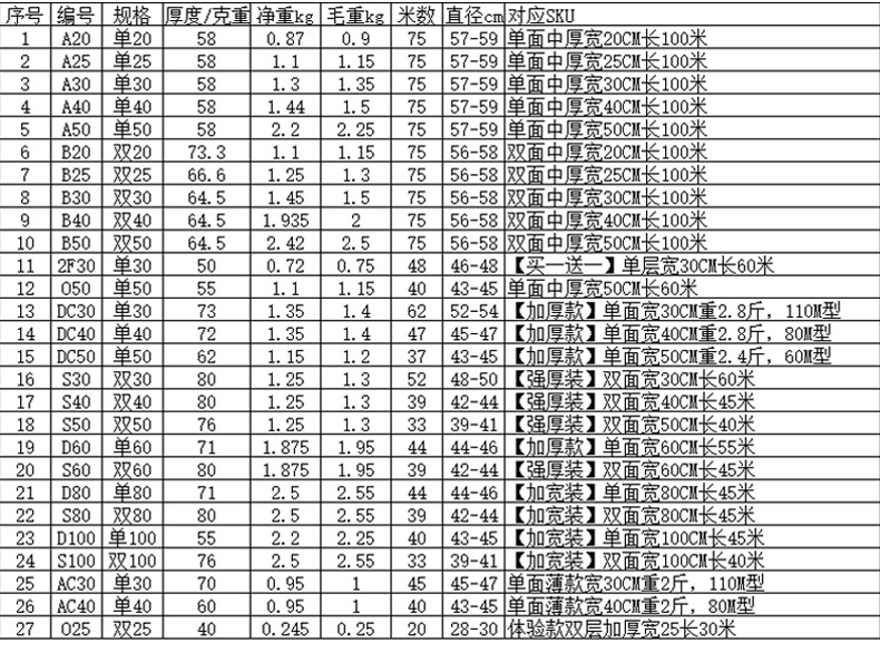 透明気泡巻き * 体験モデル単層厚さ25長さ30メートル = 0.5斤 * PE,透明気泡巻 * 【一送一を買う】単層幅30cm長さ60メートル = 3斤 * PE,透明気泡巻 * 片面中厚さ20cm長さ100メートル = 1.8斤 * PE,透明気泡巻 * 片面中厚幅25cm長さ100メートル = 2.3斤 * PE,透明気泡巻 * 片面中厚幅30cm長さ100メートル = 2.7斤 * PE,透明気泡巻 * 片面中厚幅40cm長さ100メートル = 3斤 * PE,透明気泡巻 * 片面中厚幅50cm長さ100メートル = 4.5斤 * PE,透明気泡巻 * 両面中厚さ20cm長さ100メートル = 2.3斤 * PE,透明気泡巻 * 両面中厚幅25cm長さ100メートル = 2.6斤 * PE,透明気泡巻 * 両面中厚幅30cm長さ100メートル = 3斤 * PE,透明気泡巻 * 両面中厚幅40cm長さ100メートル = 4斤 * PE,透明気泡巻 * 両面中厚幅50cm長さ100メートル = 5斤 * PE,透明気泡巻 * 【厚さ金】片面幅30cm重さ2.8斤、110mタイプ * PE,透明気泡巻 * 【厚さ金】片面幅40cm重さ2.8斤、80m型 * PE,透明気泡巻 * 【厚さ金】片面幅50cm重さ2.4斤、60m型 * PE,透明気泡巻 * 【厚さ金】片面幅60cm長さ55メートル = 3.9斤 * PE,透明気泡巻 * 【強厚装】両面幅30cm長さ60メートル = 2.6斤 * PE,透明気泡巻 * 【強厚装】両面幅40cm長さ45メートル = 2.6斤 * PE,透明気泡巻 * 【強厚装】両面幅50cm長さ40メートル = 2.6斤 * PE,透明気泡巻 * 【強厚装】両面幅60cm長さ45メートル = 3.9斤 * PE,透明気泡巻 * 【拡幅装】片面幅80cm長さ45メートル = 5.1斤 * PE,透明気泡巻 * 【幅を広げる】両面幅80cm長さ40メートル = 5.1斤 * PE,透明気泡巻 * 【拡幅装】片面幅100cm長さ45メートル = 4.5斤 * PE,透明気泡巻 * 【幅を広げる】両面幅100cm長さ40メートル = 5.1斤 * PE,透明気泡巻 * 片面薄金幅30cm重さ2斤、110m型 * PE,透明気泡巻 * 片面薄幅40cm重さ2斤、80m型 * PE,透明気泡巻 * 片面薄金幅50cm重さ2.3斤、60m型 * PE