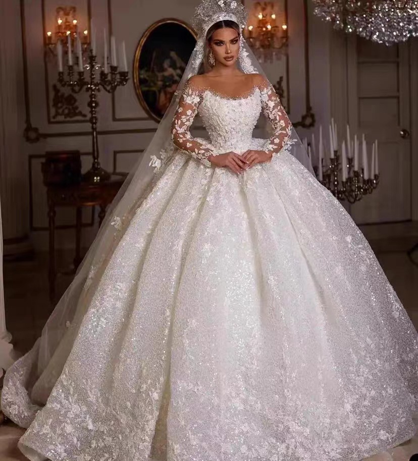 2025 新しい外国貿易アマゾンメインウェディングドレスファッショナブルな光沢のある長袖ウエディングドレスウエストバックレススパンコールのウェディングドレス