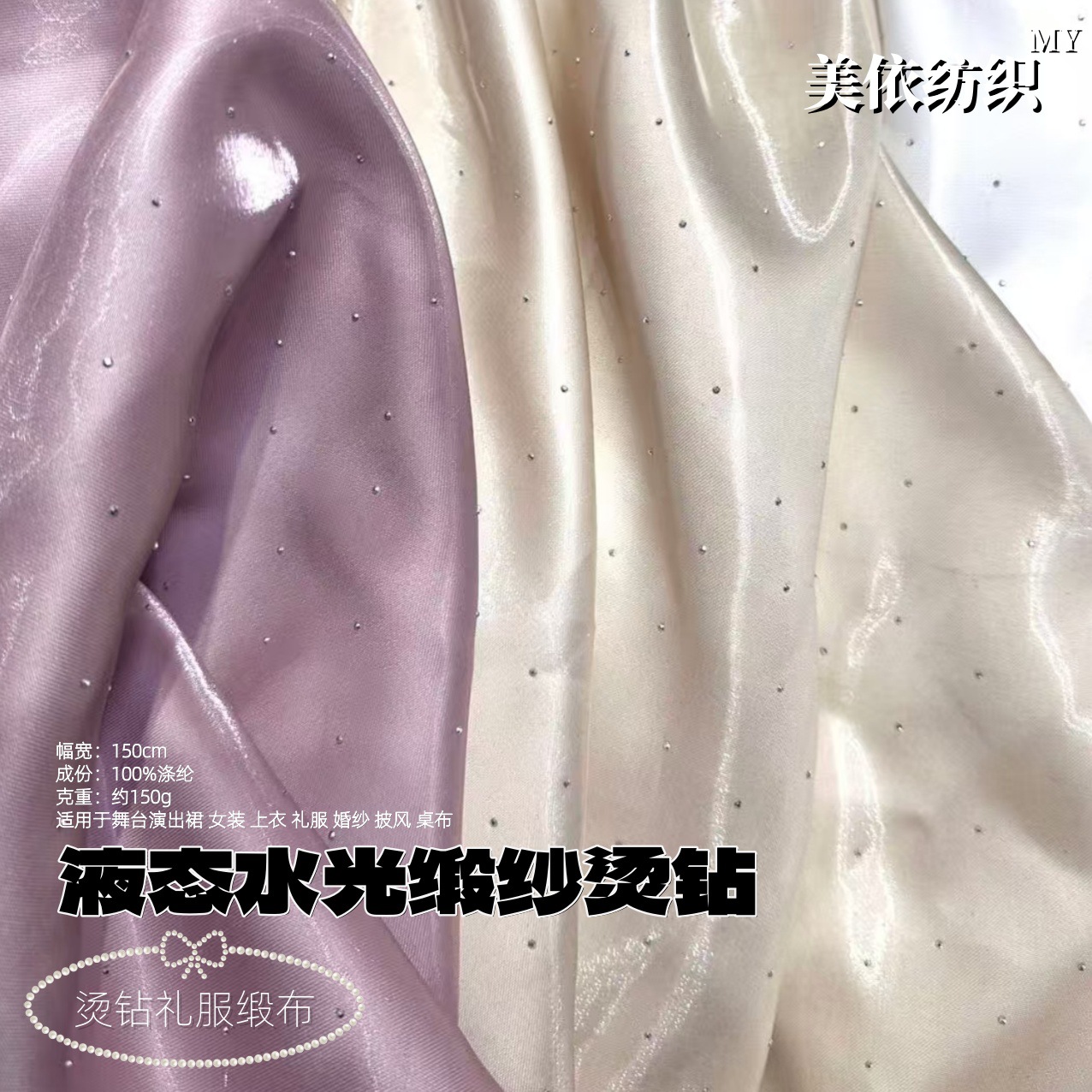 液体パリサテン、水光サテン、ホットフィックスストーン付き生地、ウェディングドレス、ハンドバッグ、子供服、ワンピース、カジュアルウェア、フォーマルウェア、ファッション生地