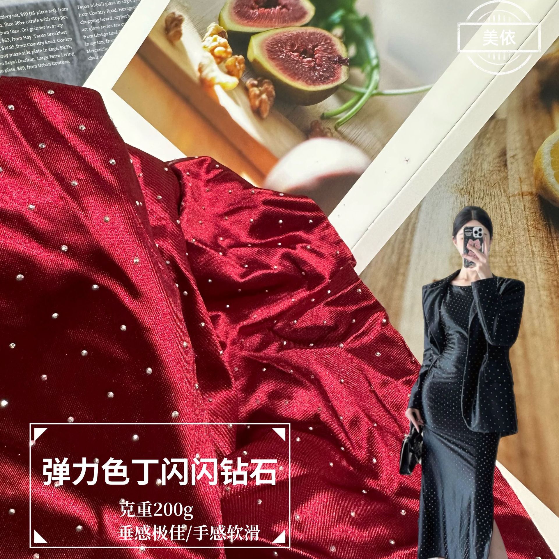加厚弹力色丁布料 闪亮撒粉烫钻工艺面料 弹力晚会礼服演出服面料