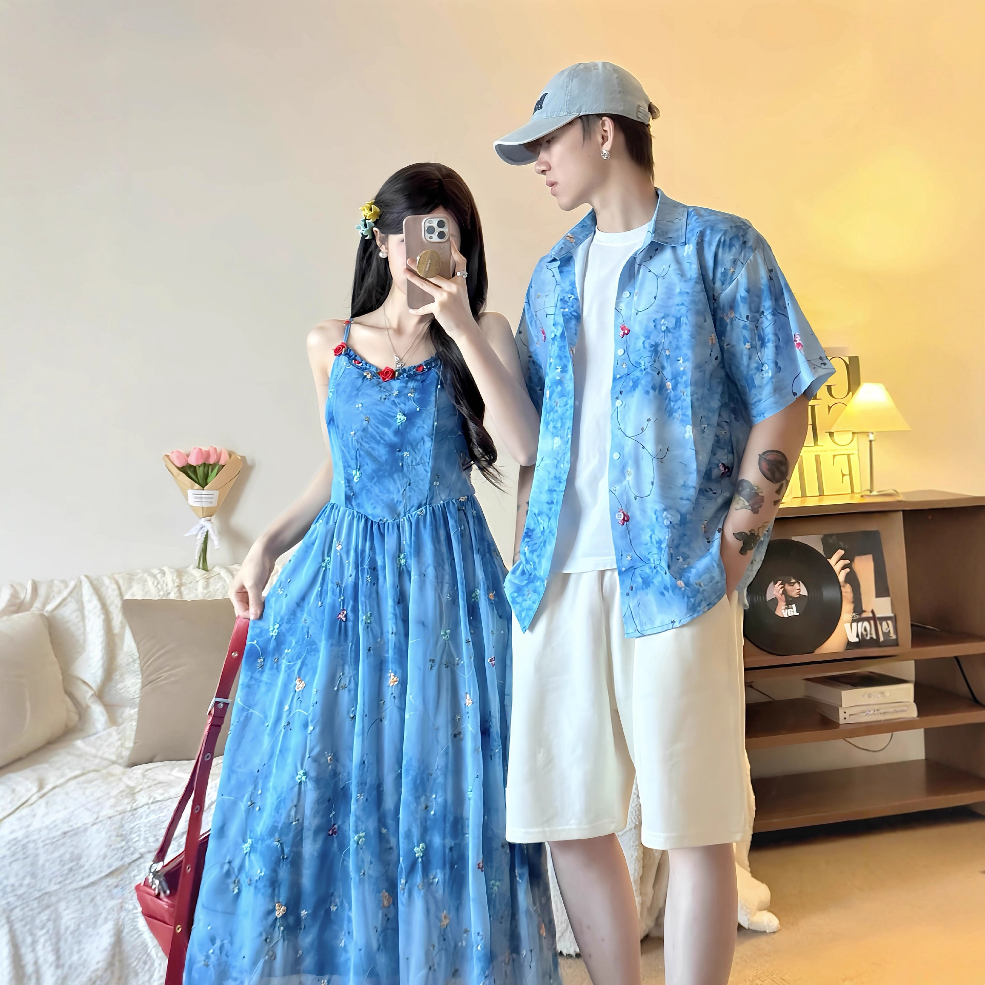 巴厘岛旅游情侣装夏季新款海边沙滩设计碎花无袖吊带女连衣裙衬衫