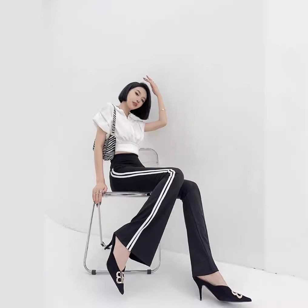 ダブルストライプの後ポケットの小さいラッパのズボンのバービーの腰が高くて痩せています。