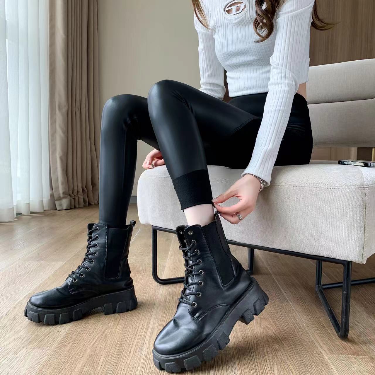 羊の小毛の皮のズボンの女性の外はベルベットを着てズボンを厚くして腰が高くてやせているガードルの大きいサイズのpu皮の保温ズボンを現します。