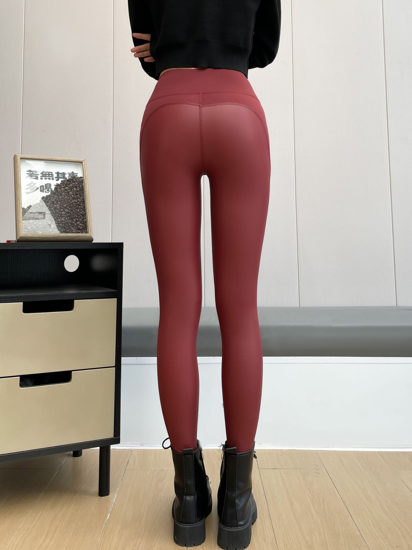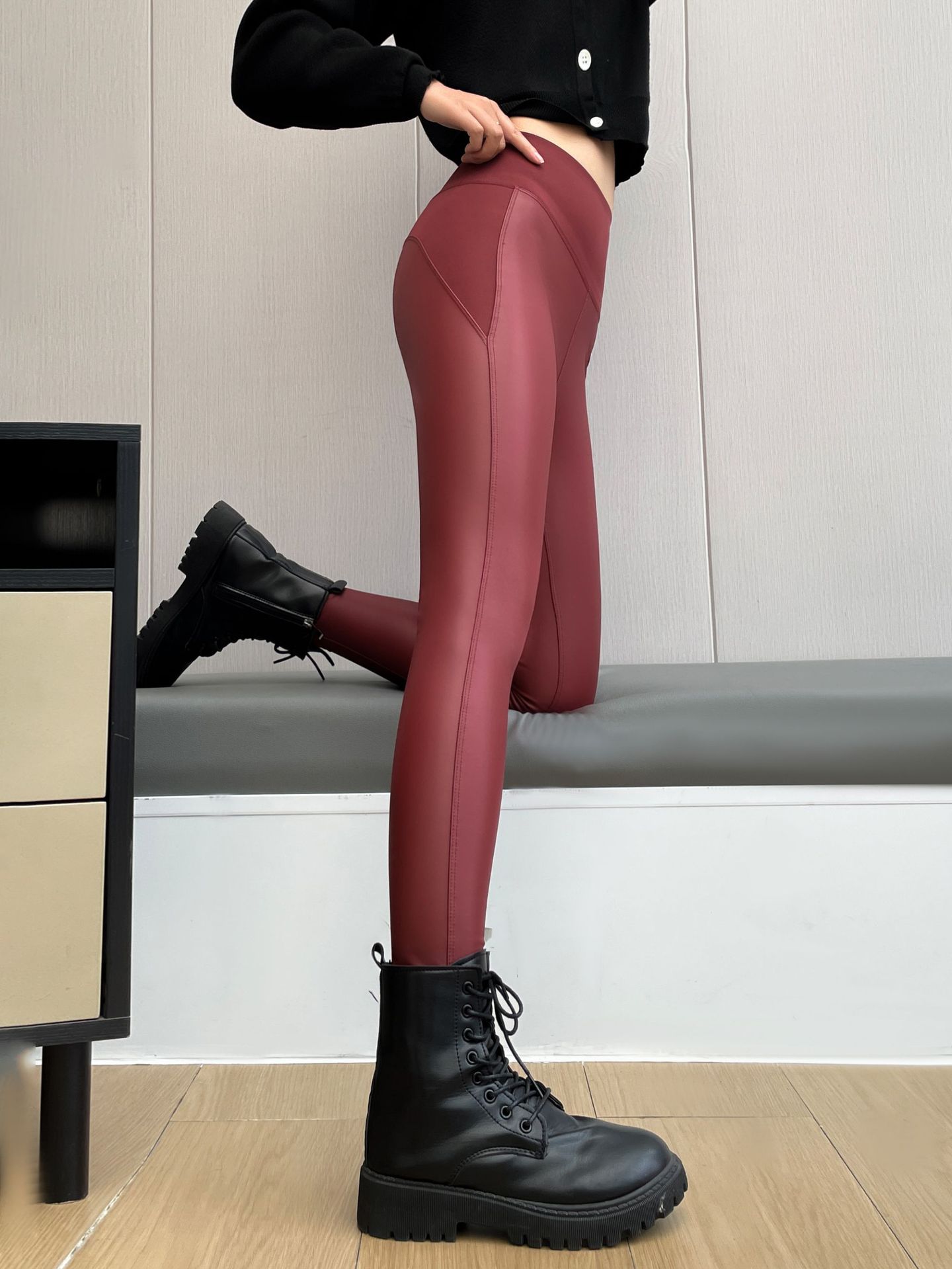 黒桃モダンマットPUレザーパンツ レディース 秋冬 薄手ベルベット9分丈レギンス ハイウエストヒップアップタイトフィット バイク風バービーパンツ