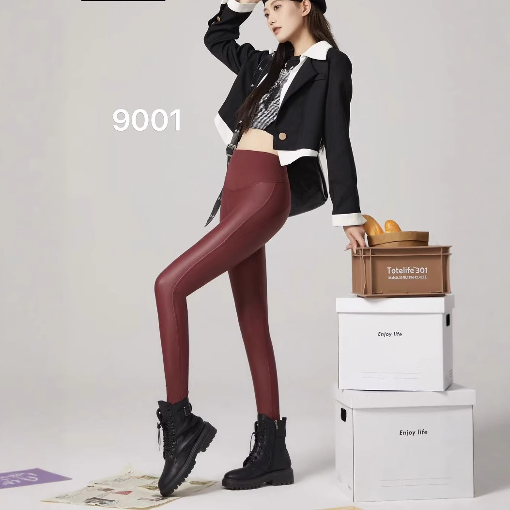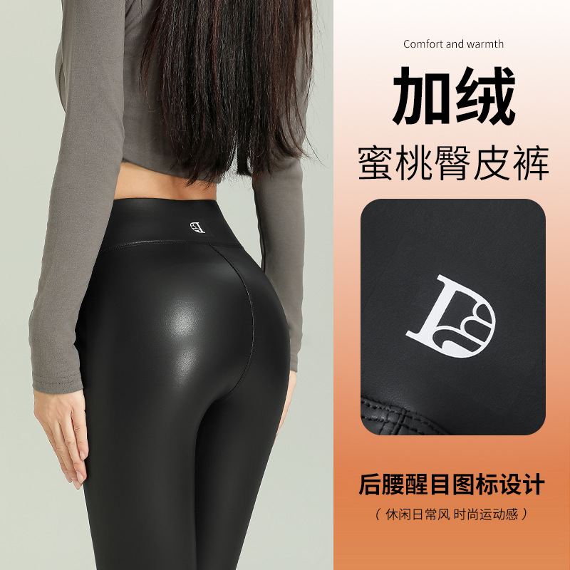 女性用の新しい秋と冬のタイトな弾性レザーパンツ、ベルベットの薄い小脚パンツ、ハイウエストの痩身アウターレイヤーヨガパンツ