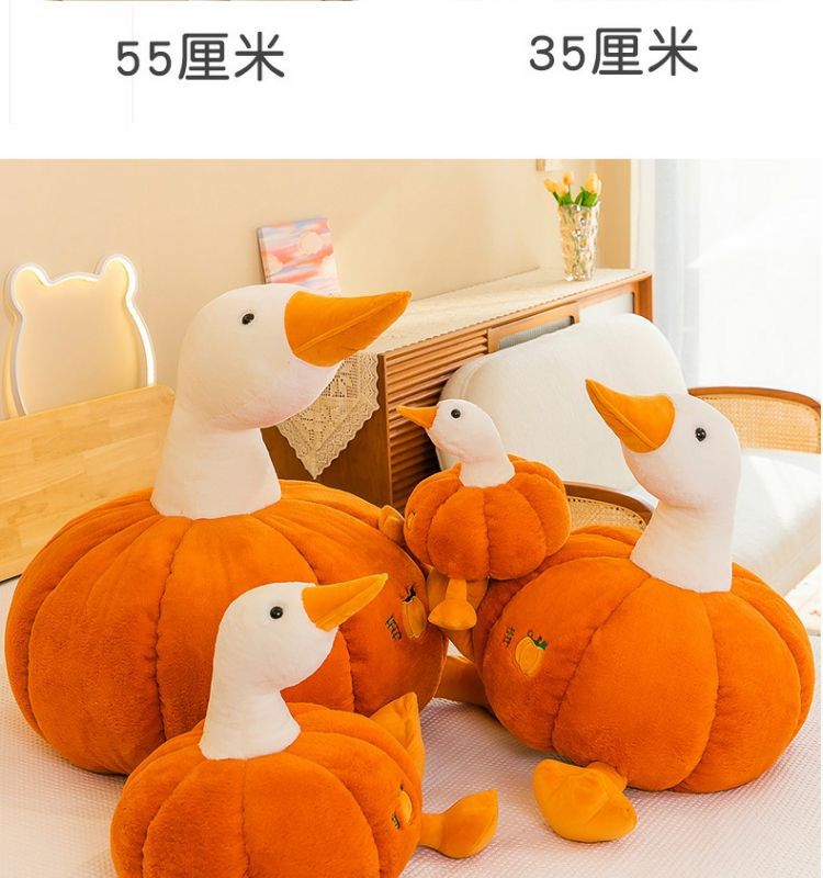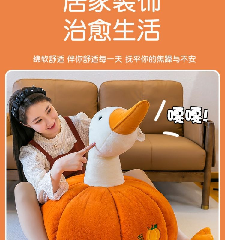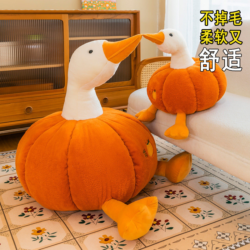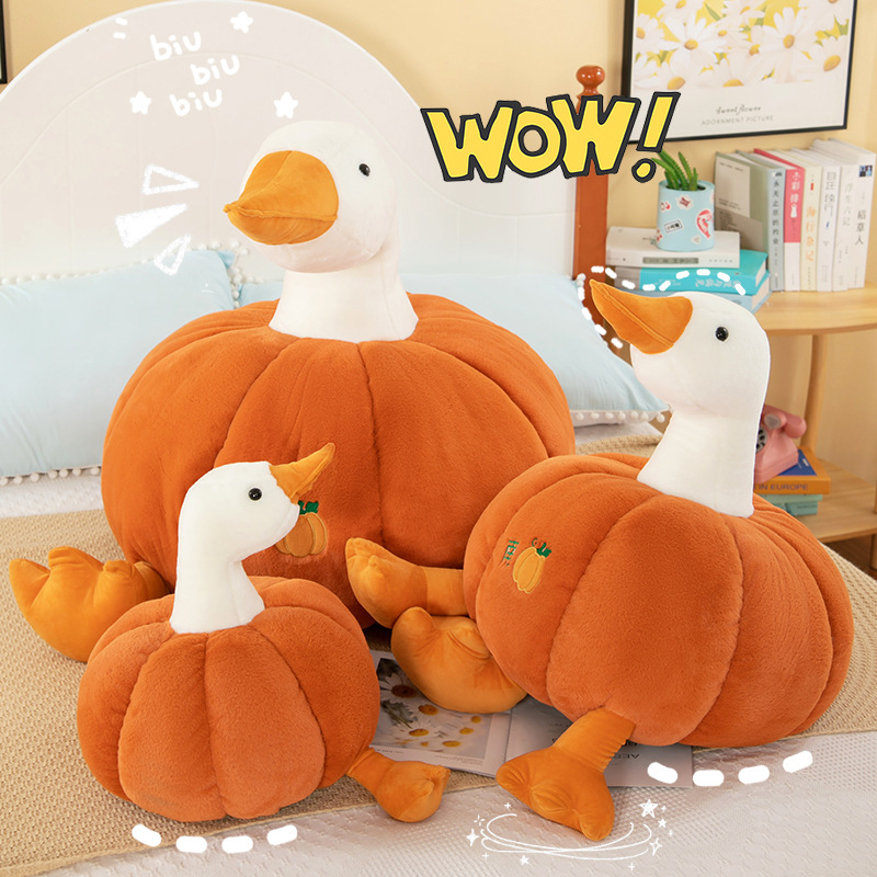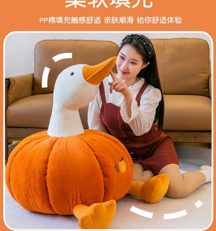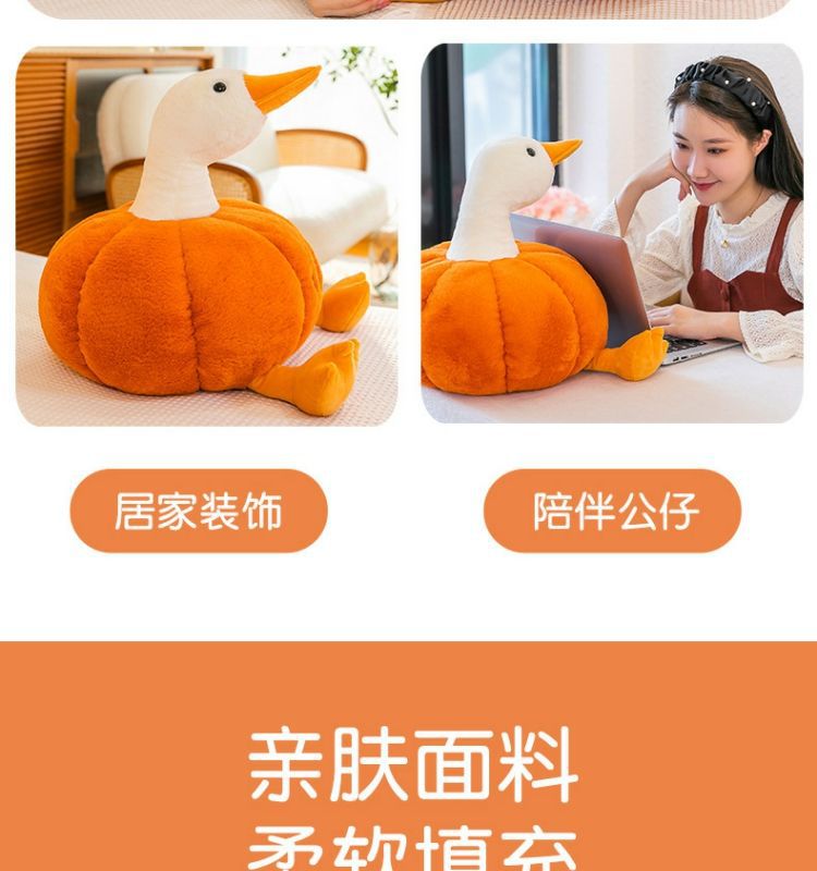 かわいいガチョウのぬいぐるみのアイデアカボチャのアヒルのぬいぐるみが枕を抱いて女の子の友達のプレゼントを責めます。