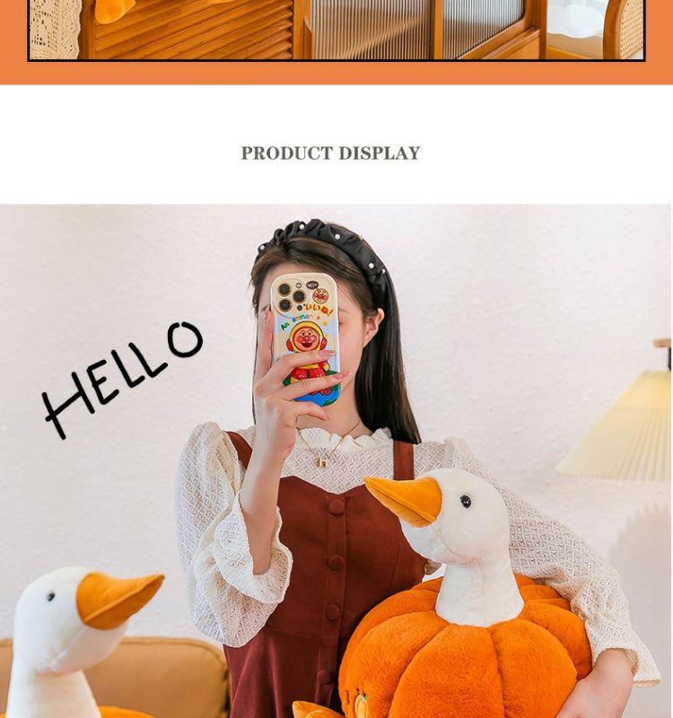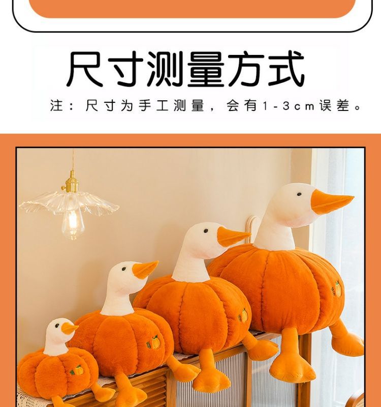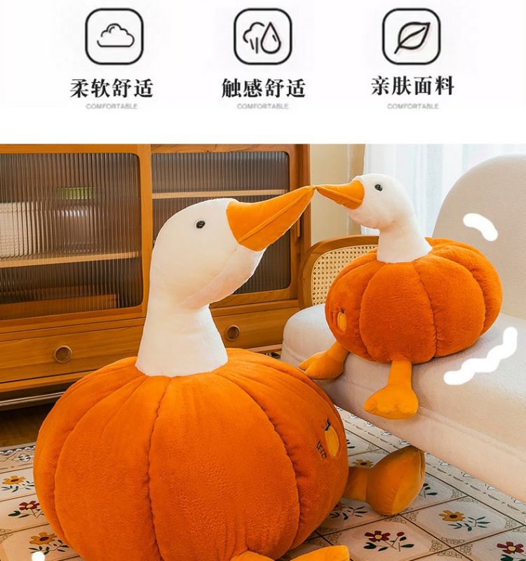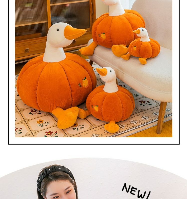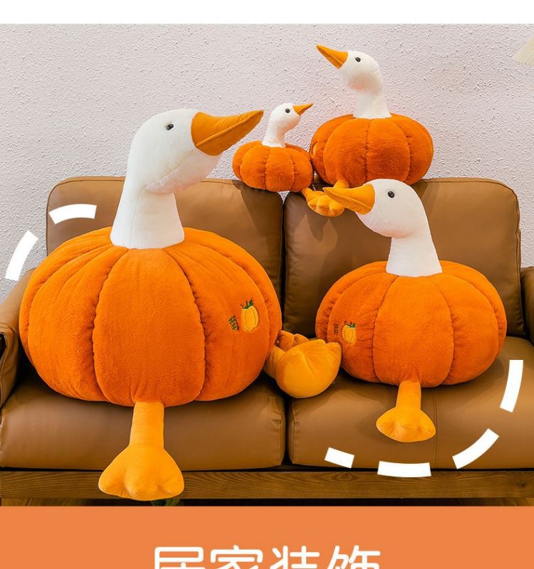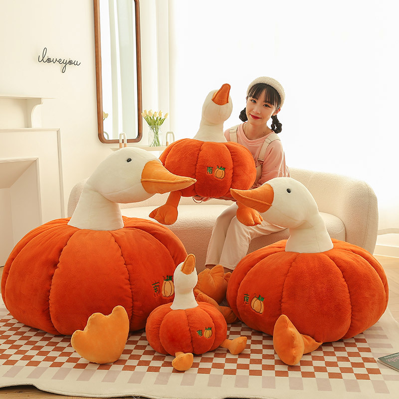 かわいいガチョウのぬいぐるみのアイデアカボチャのアヒルのぬいぐるみが枕を抱いて女の子の友達のプレゼントを責めます。