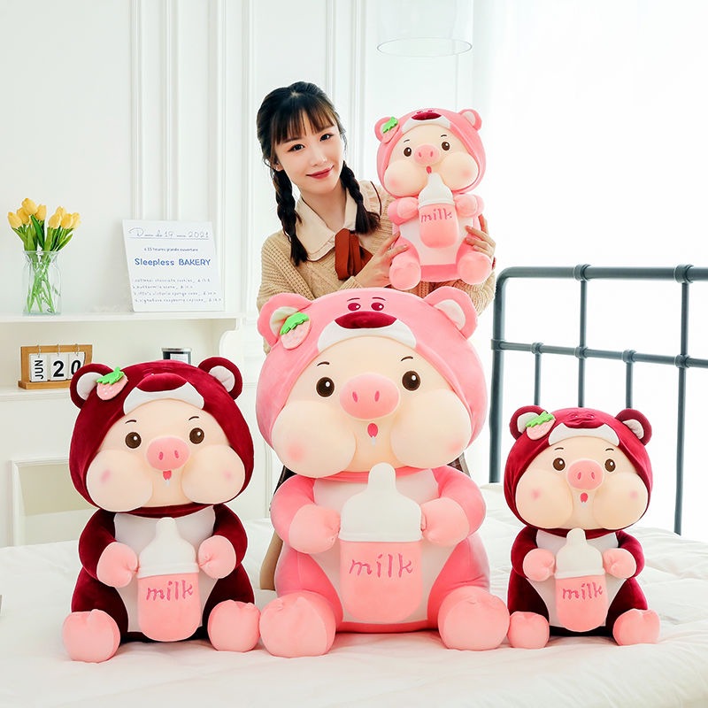 かわいいイチゴの哺乳瓶が豚のぬいぐるみに変身しました。