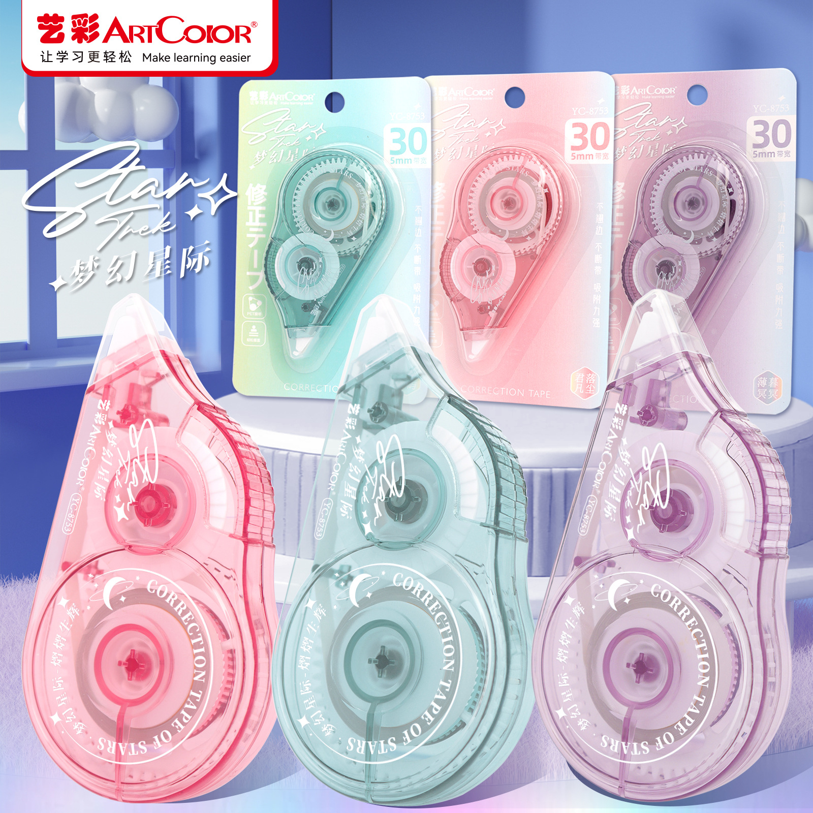 修正帯は大量に卸売りしています。3つの包装は学生文房具の学習用品を包装しています。