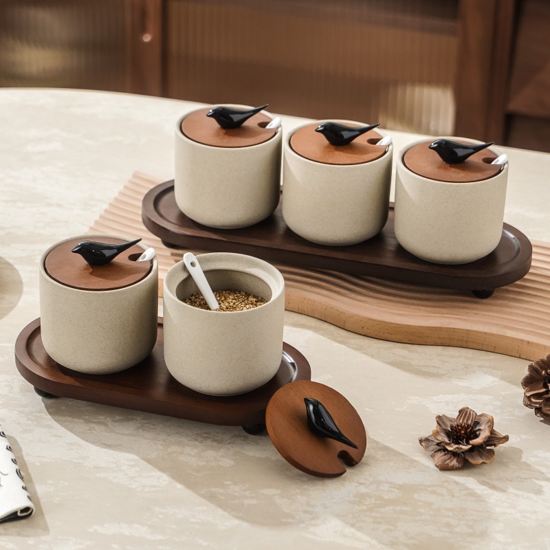 中式复古粗陶调味罐套装带托盘家用防尘盐罐调味料收纳罐油壶组合