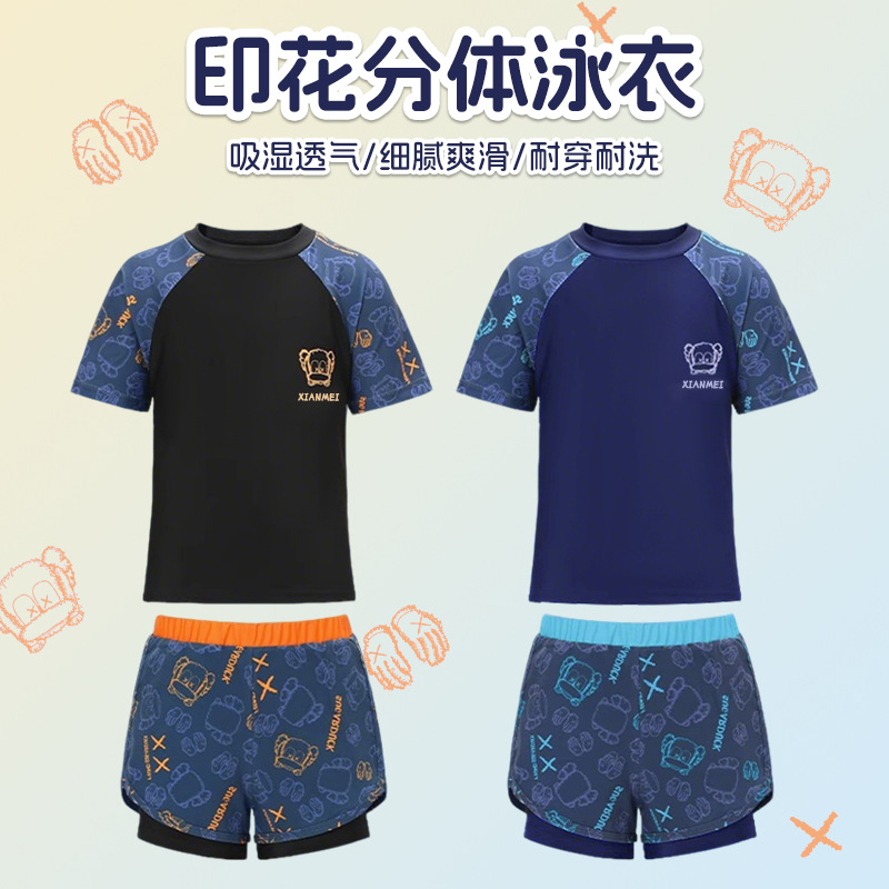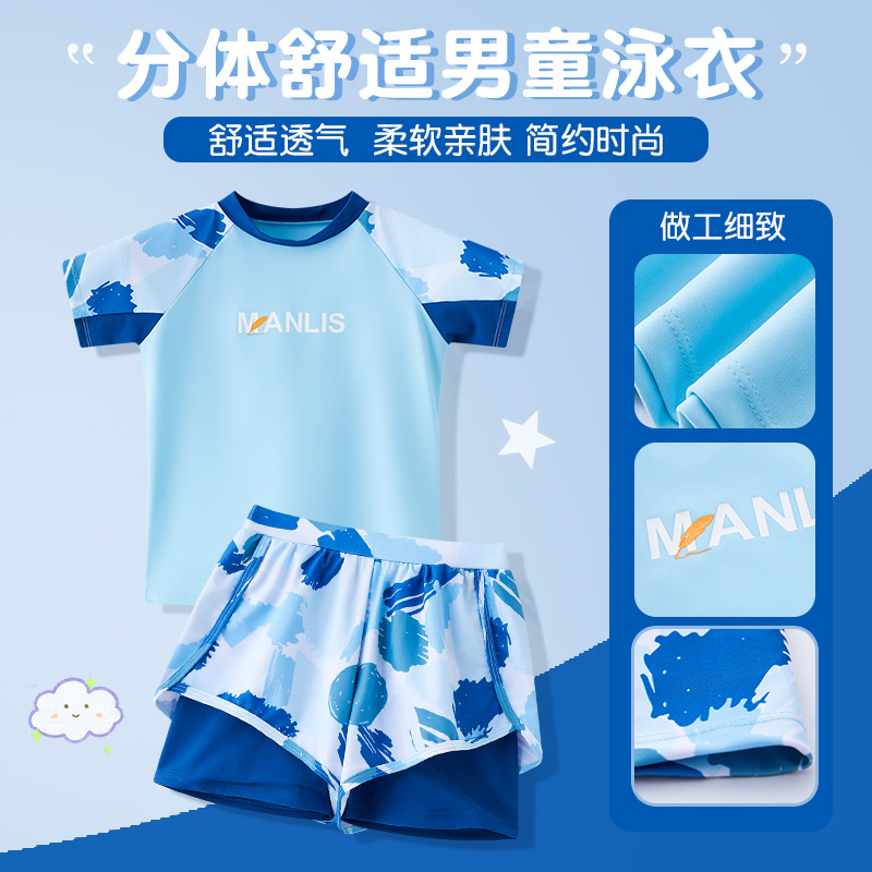 子供の水着の男の子の2025新型の分体の中で大きい子供の男の子の青少年の二重の水泳のズボンの水着のスーツ