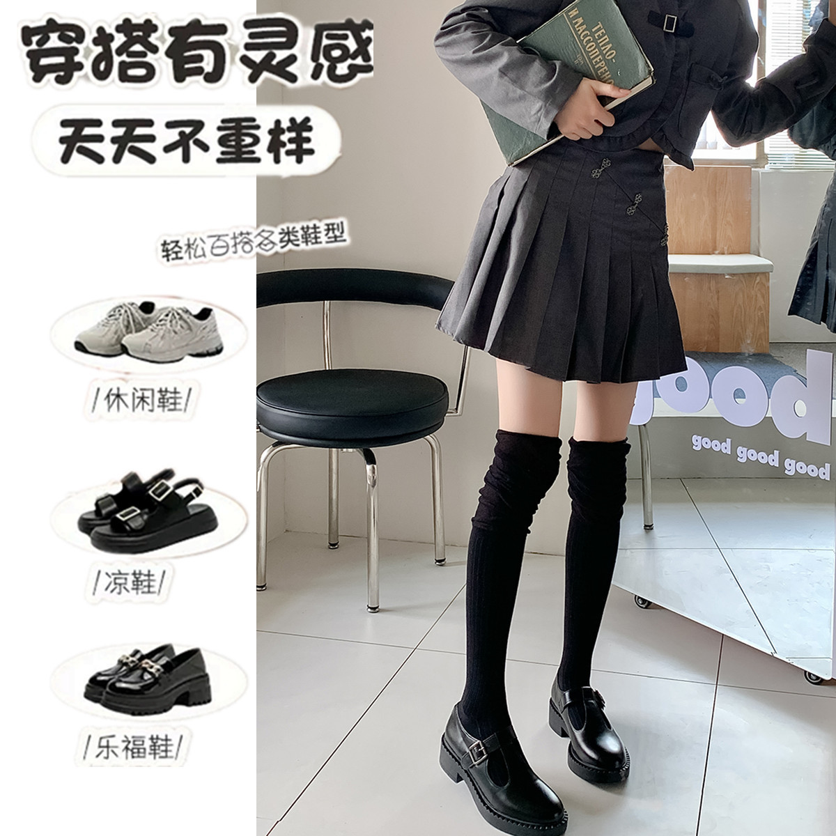 秋冬新小腿袜子女士纯色百搭微压显瘦长筒袜简约韩版芭蕾风堆堆