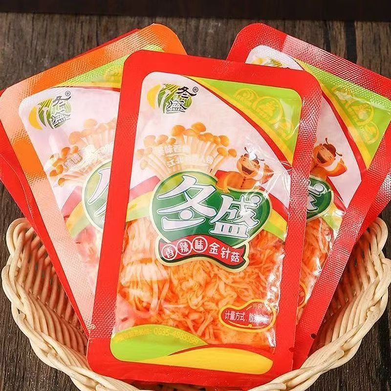 冬盛シイタケの香辛料赤油焼きキノコの爆発的な間食の下で料理を食べて料理を注文するのは独立した小さな包装です