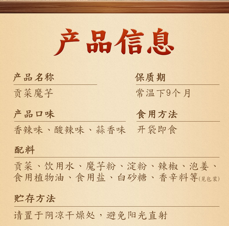 パッケージ仕様 貢菜の辛味-* 1袋,功菜の酸っぱい味 * 1袋,功菜にんにくの香り * 1袋