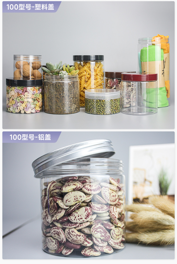 HC8512食品グレード厚型蓋付きPETプラスチックボトル、穀物、ナッツ、ビスケット用透明防湿密封容器