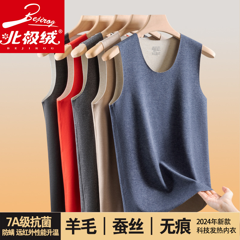羊绒蚕丝保暖背心男圆领磨毛打底衫德绒发热内衣冬季纯色保暖马甲