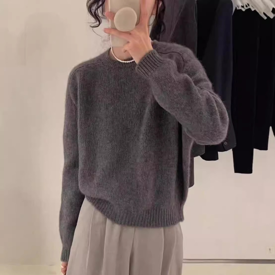 秋冬日系厚手通勤ゆったり型丸襟プルオーバー100ウールセーター肩袖ニット女性
