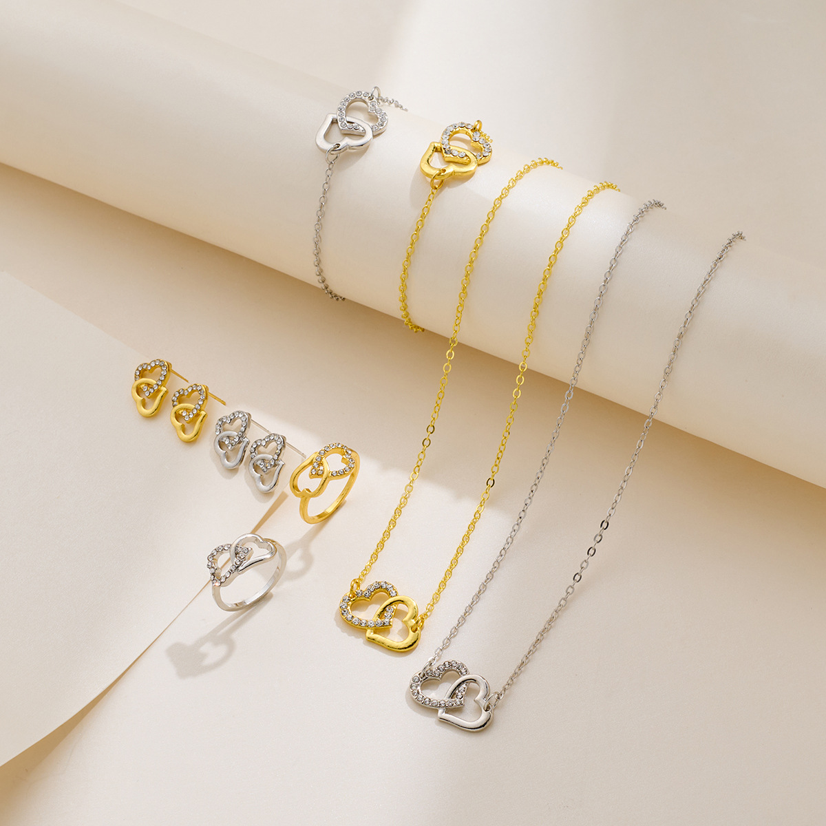 新しいファッションヨーロッパとアメリカのシンプルなダブルラブネックレスジュエリーセットライトラグジュアリースタイルブライダルダブルピーチハートジュエリー4点セット
