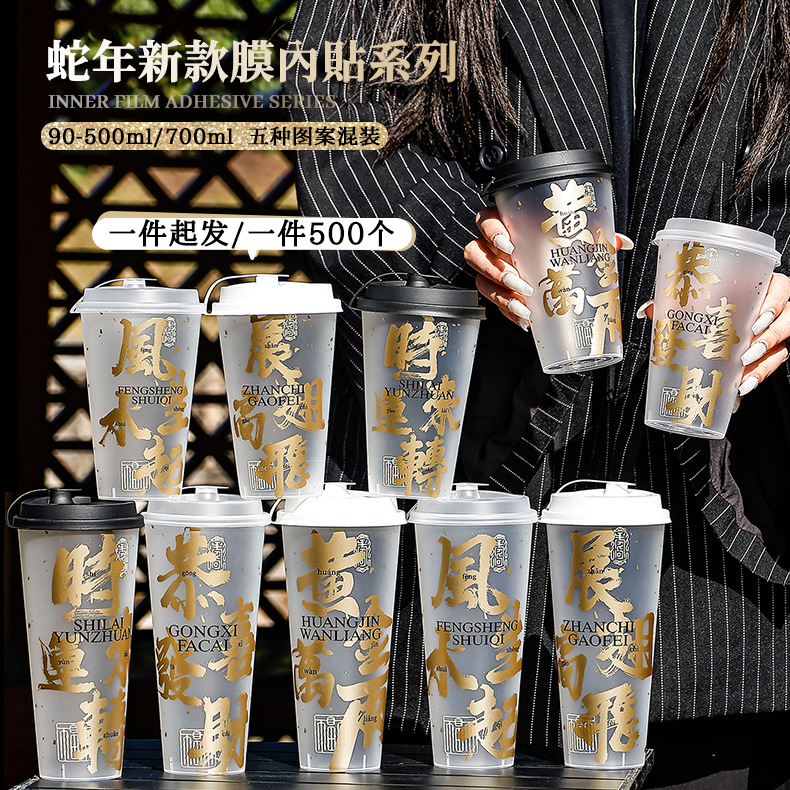 使い捨てミルクティーカップ90口新年国風金色フィルム内貼り厚い卸売り透明700ml射出コップ