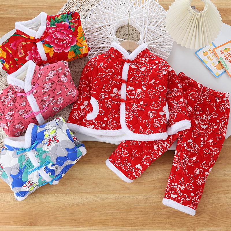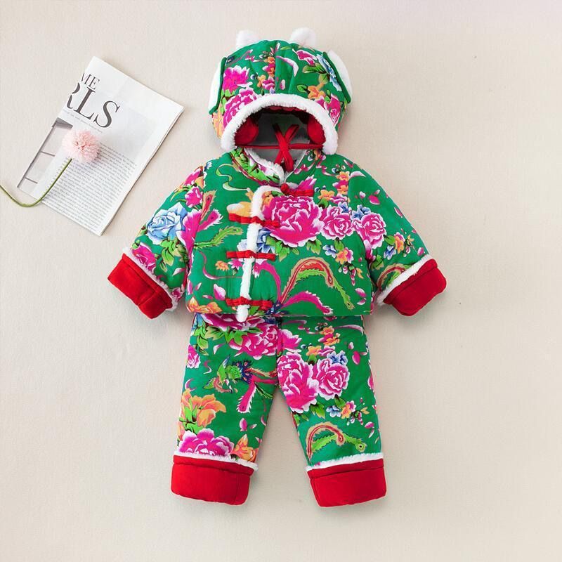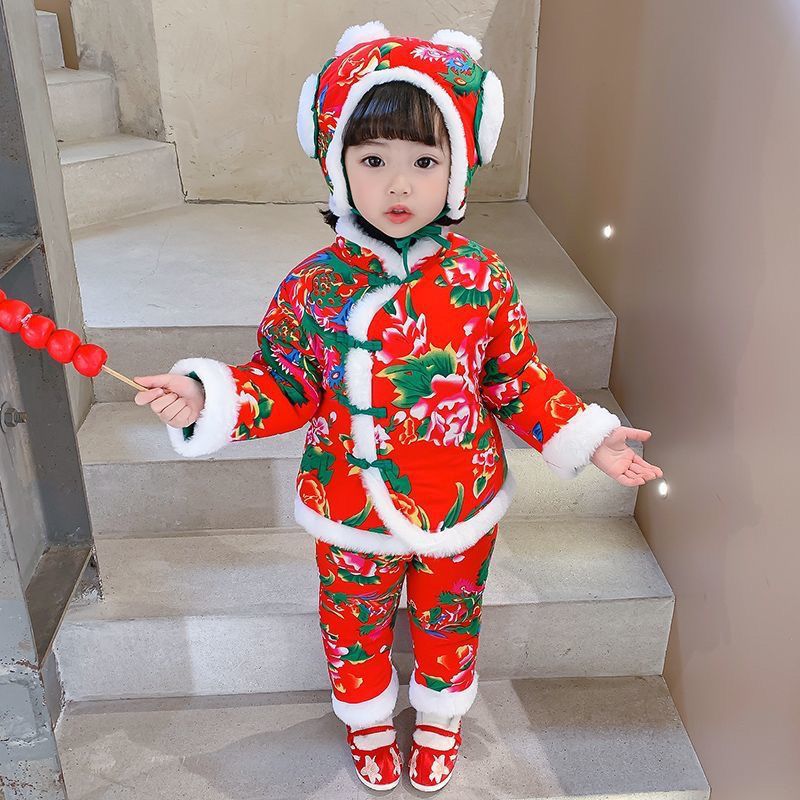 東北の大きい花の綿入れの上着の子供の冬の綿服の赤ちゃんの女の子の厚いスーツの新年の男の子の服の綿入れの赤ちゃん