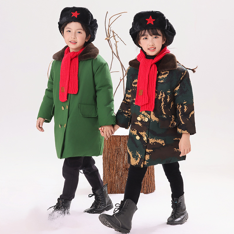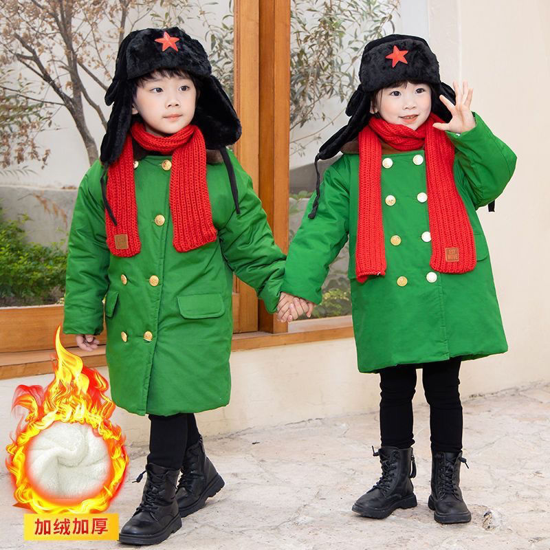儿童大衣夹棉加厚保暖宝宝中长款军绿色男童复古外套老式棉衣加绒