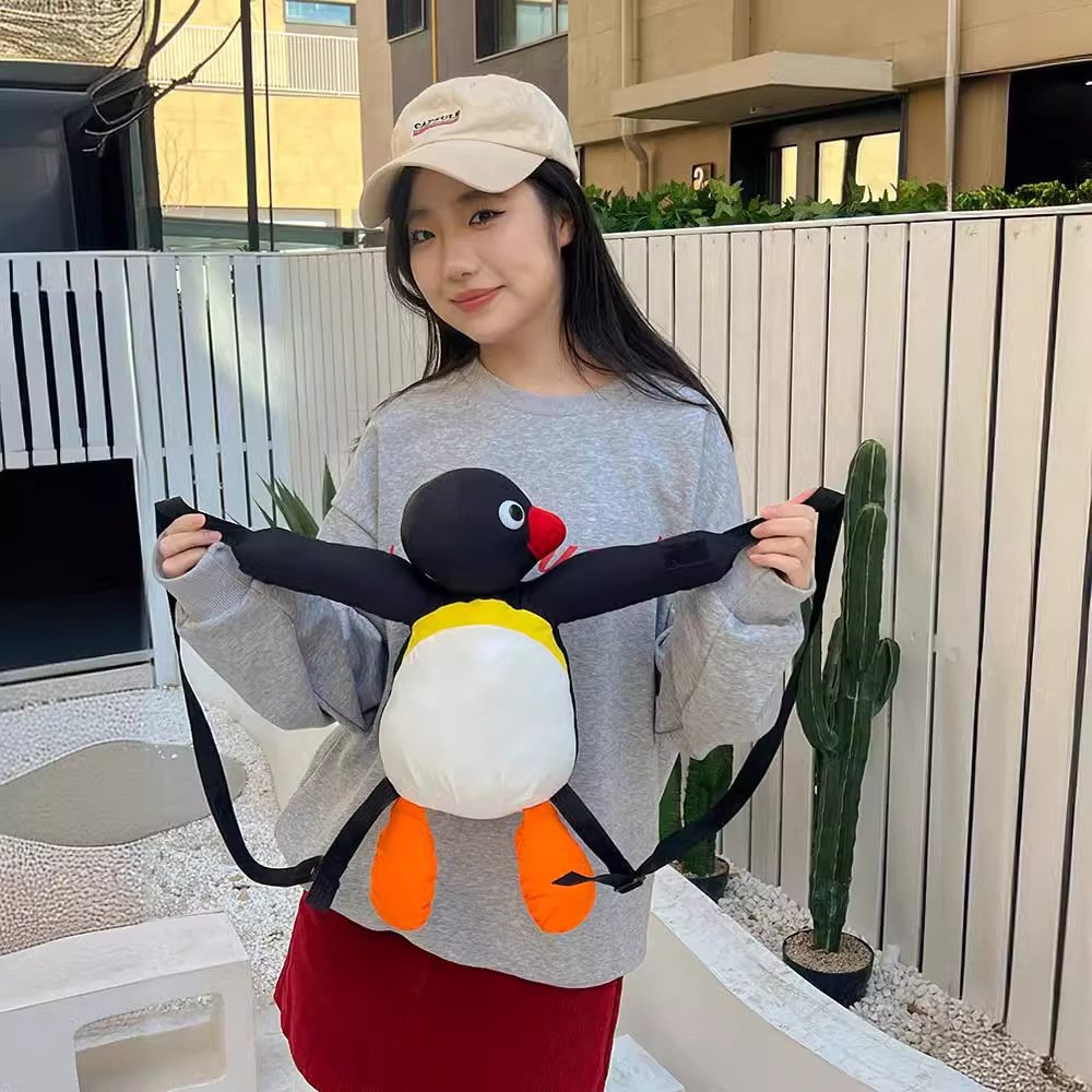 アニメのおかしな萌えはペンギンの肩を抱いてファッション的な個性のぬいぐるみを抱いて子供のカバンを包みます。