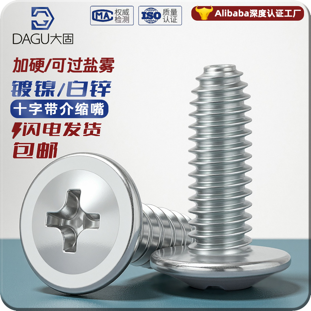 十字型メッキニッケル白亜鉛ネジ、圧花加工、回転防止、非三角歯、セルフロック式