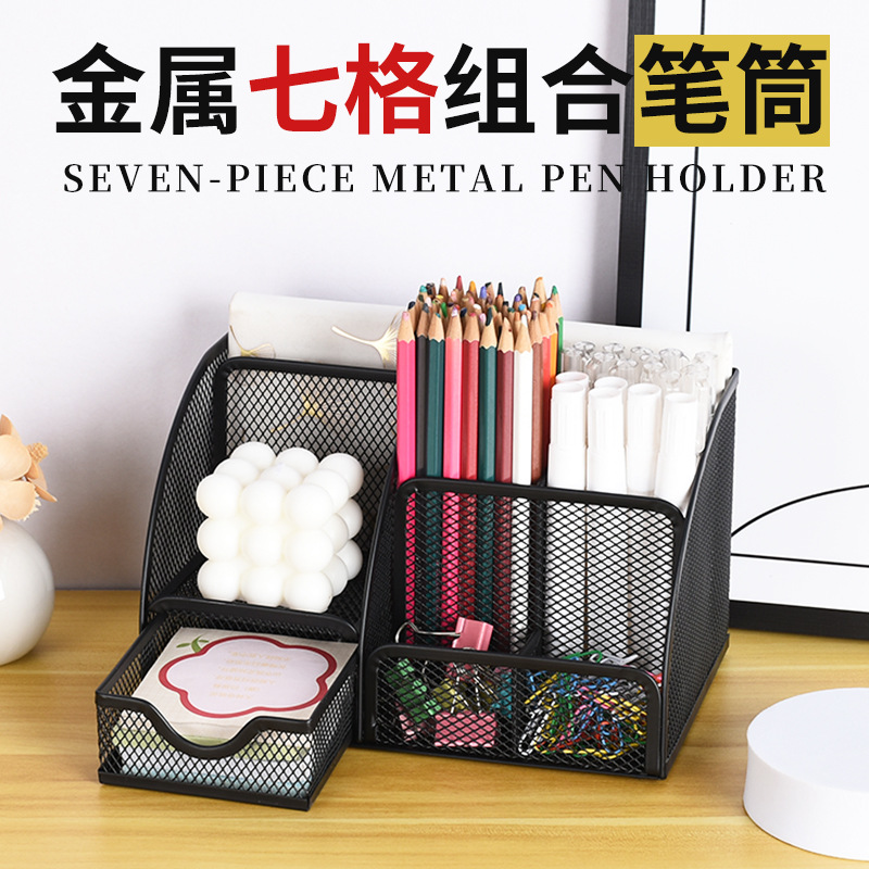 金属七格组合大容量笔筒铁网加厚笔筒桌面收纳可办公桌面收纳批发