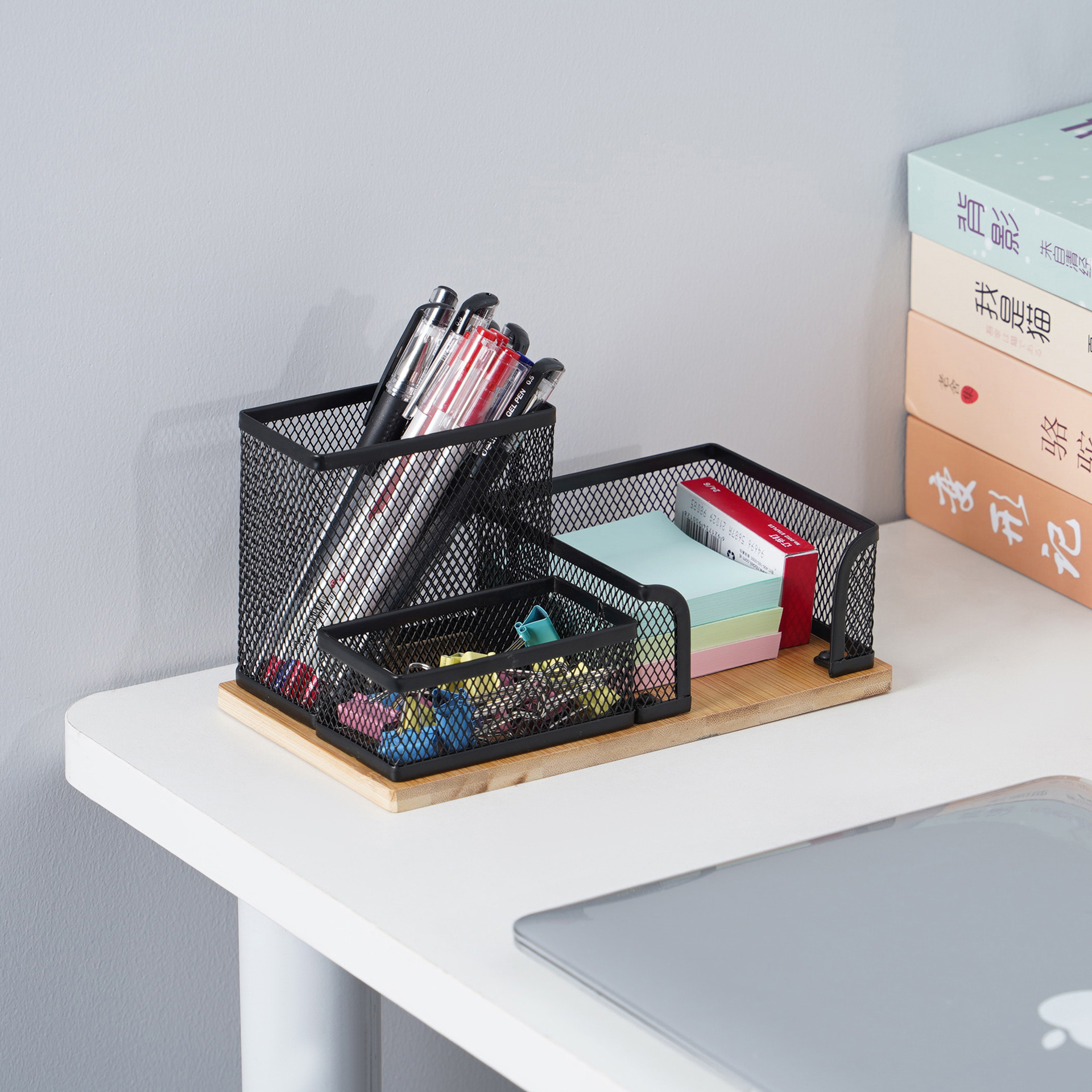 多機能分類収納ボックスノートボックスデスクトップ金属グリッドペンホルダー竹ボードクリエイティブオフィス文具整理