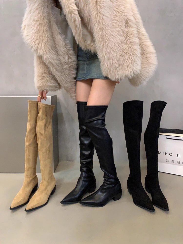 女性用ラージチューブナイトブーツ2025秋冬新作レトロ膝上ブーツポインテッドトゥ太いヒールスリムパイルブーツ女性用