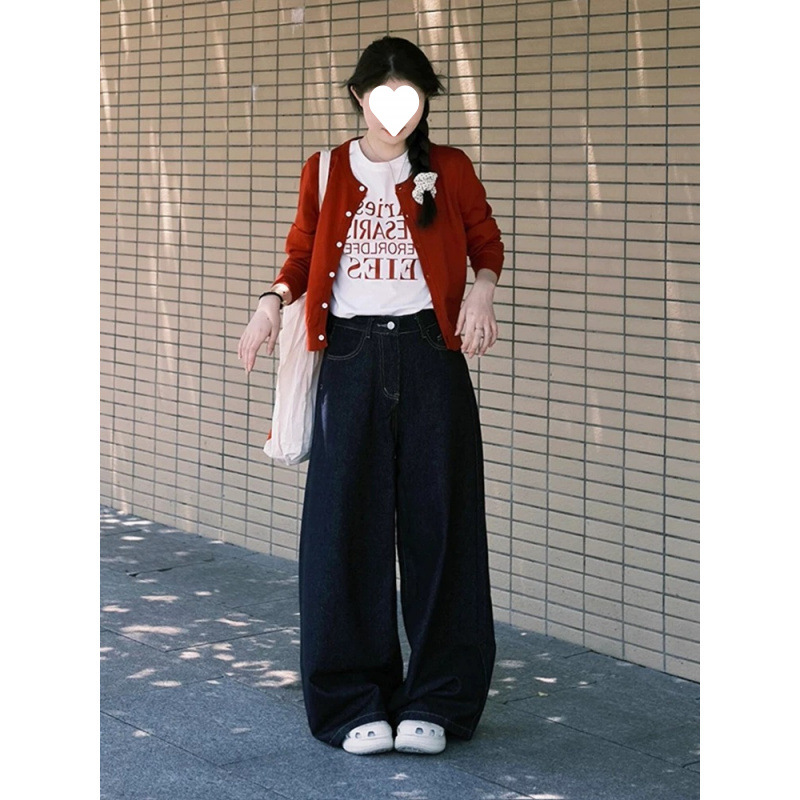 秋の服と年齢を減らして赤いカーディガンのワイドパンツのセットを着ます。