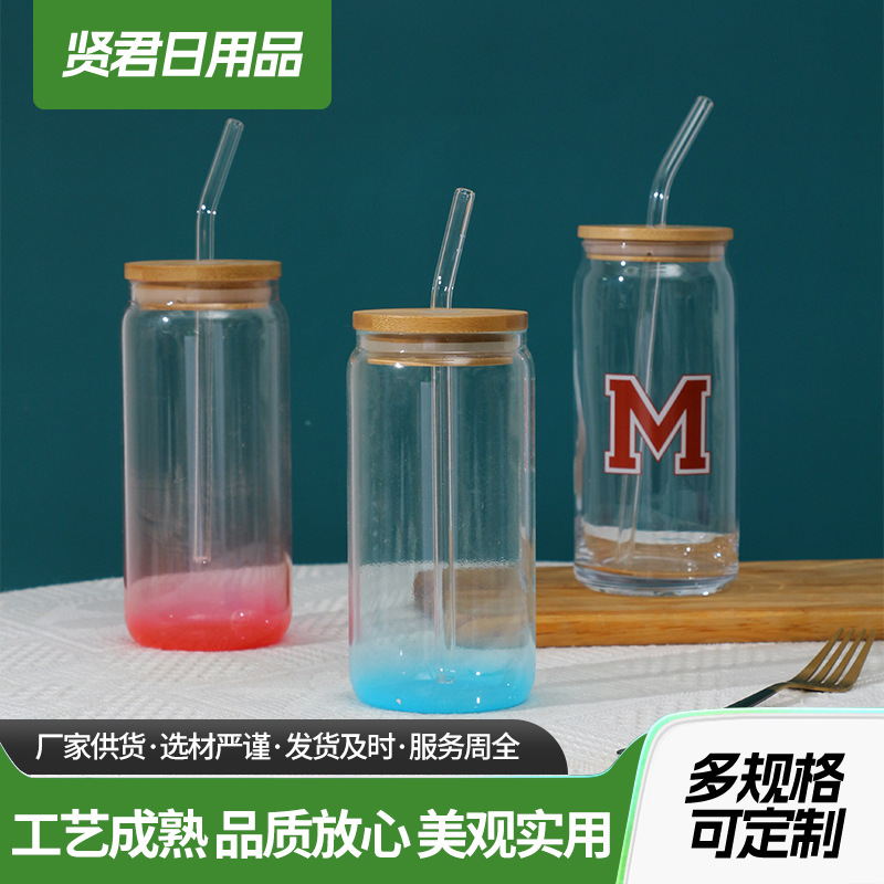 クリエイティブ透明缶型高ホウ素シリコンコーラカップガラスカップ蓋付きストロー飲料ジュースカップ