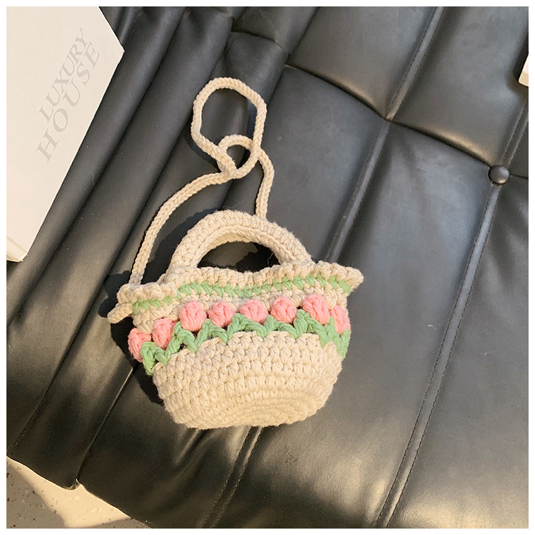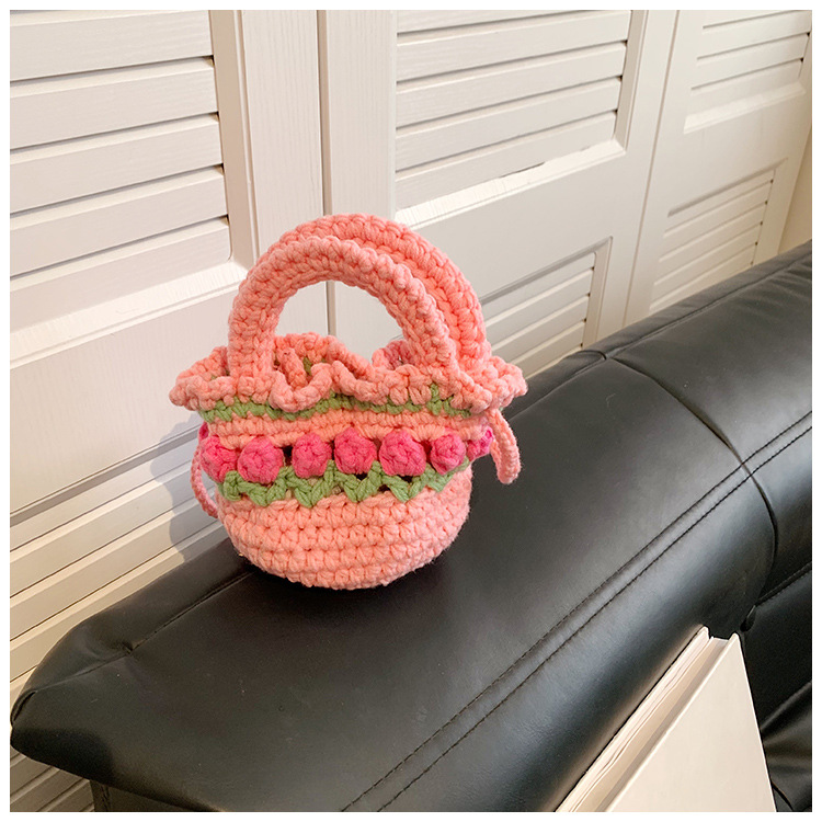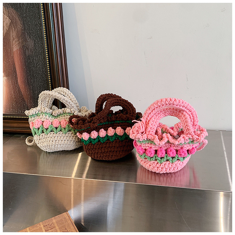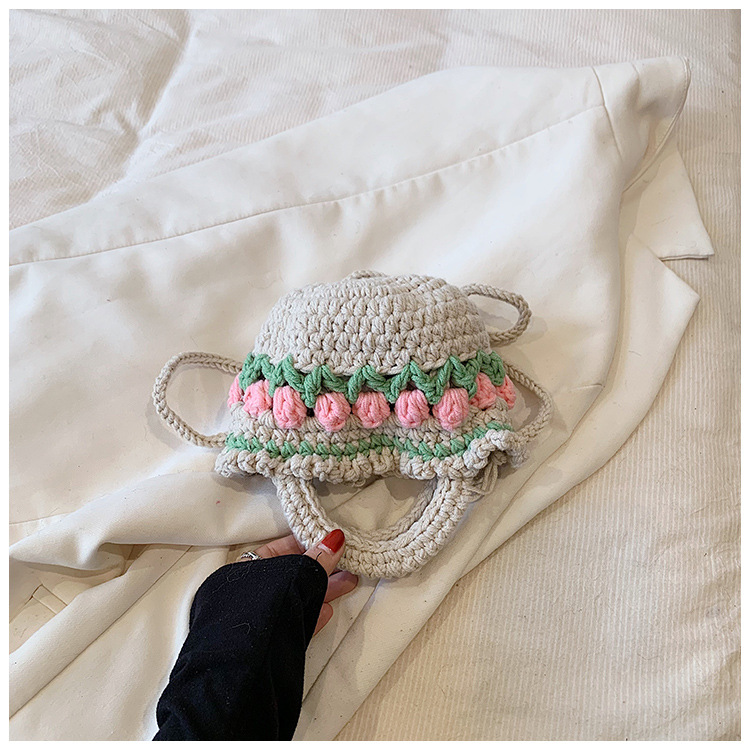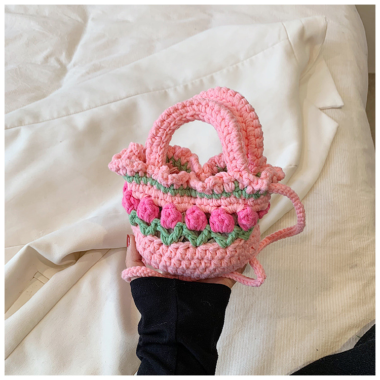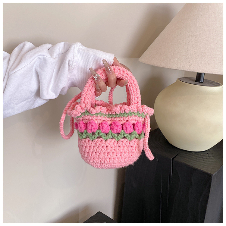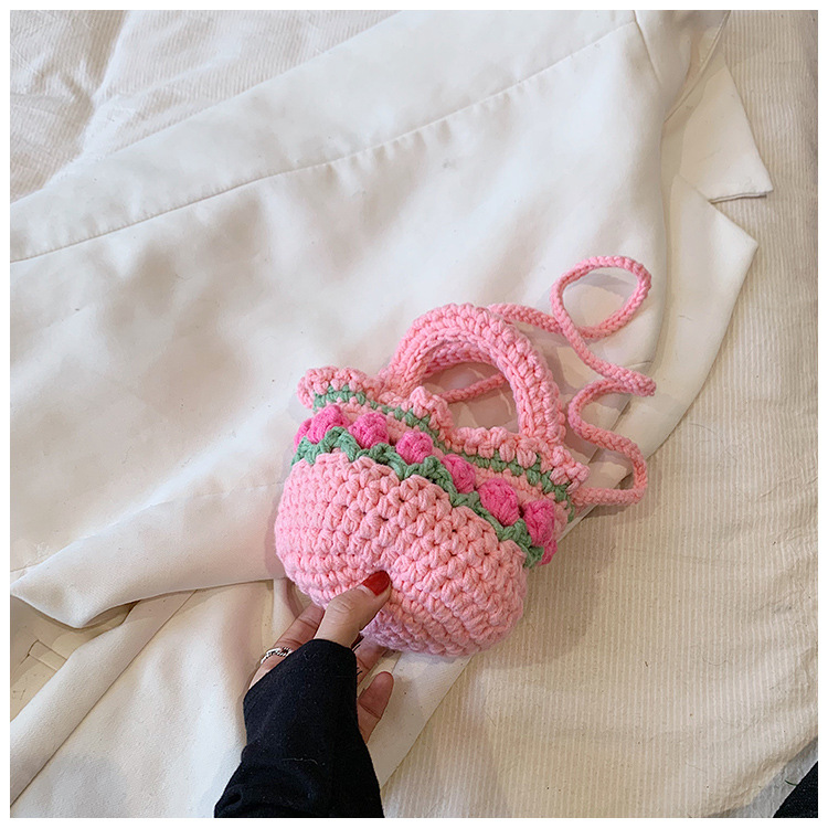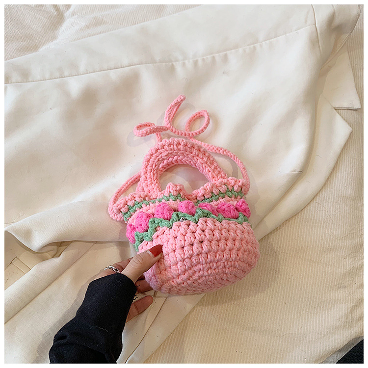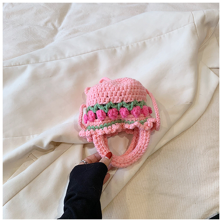 チューリップの花の手提げの子供の小さい包みの王女の毛糸はかわいい新型の女の子の肩の野菜のかごの包みを編みます。