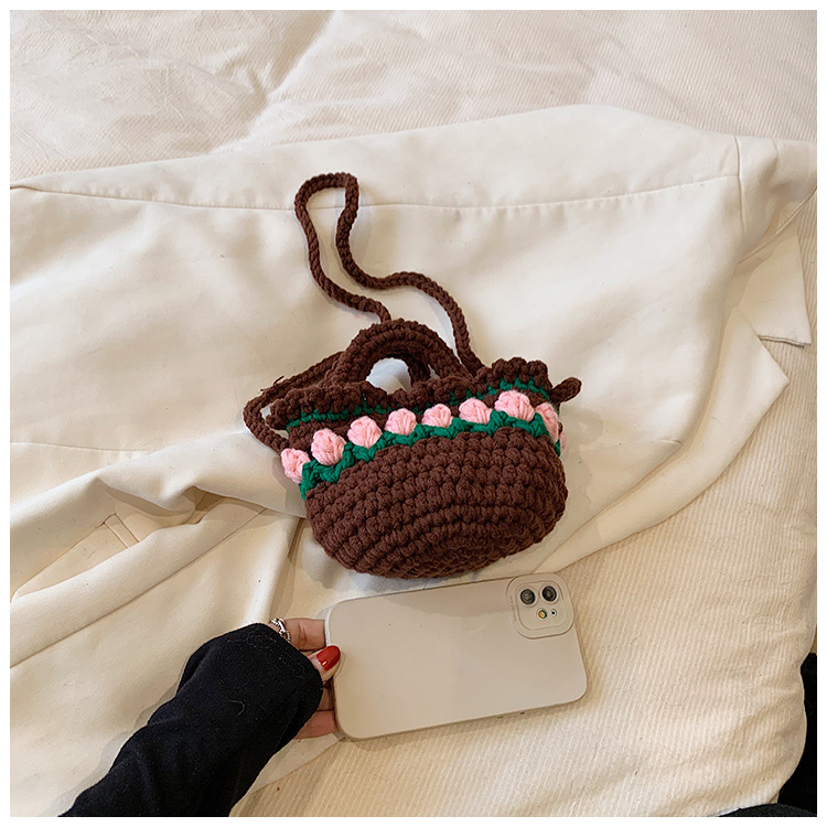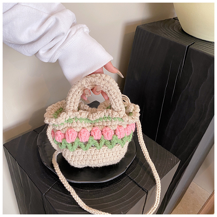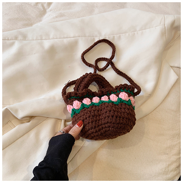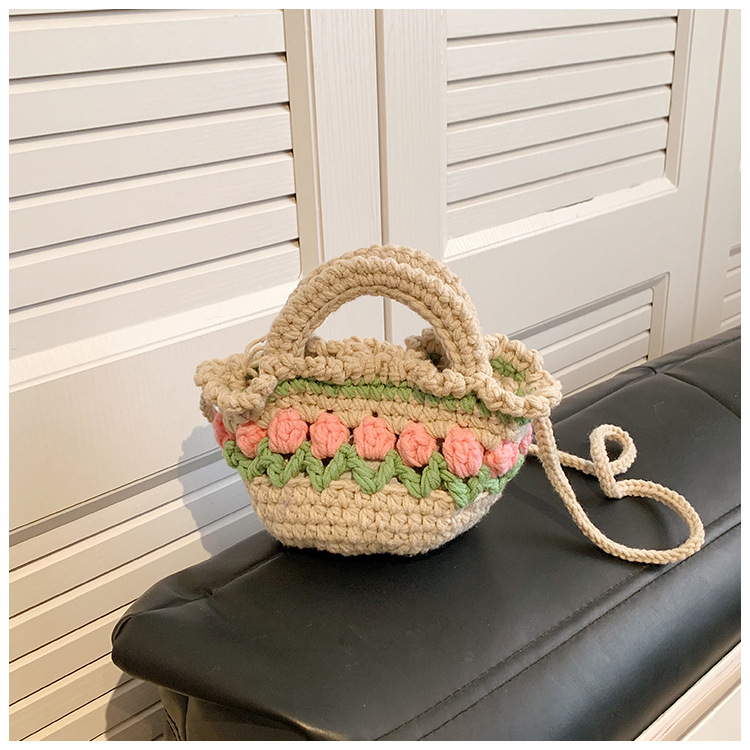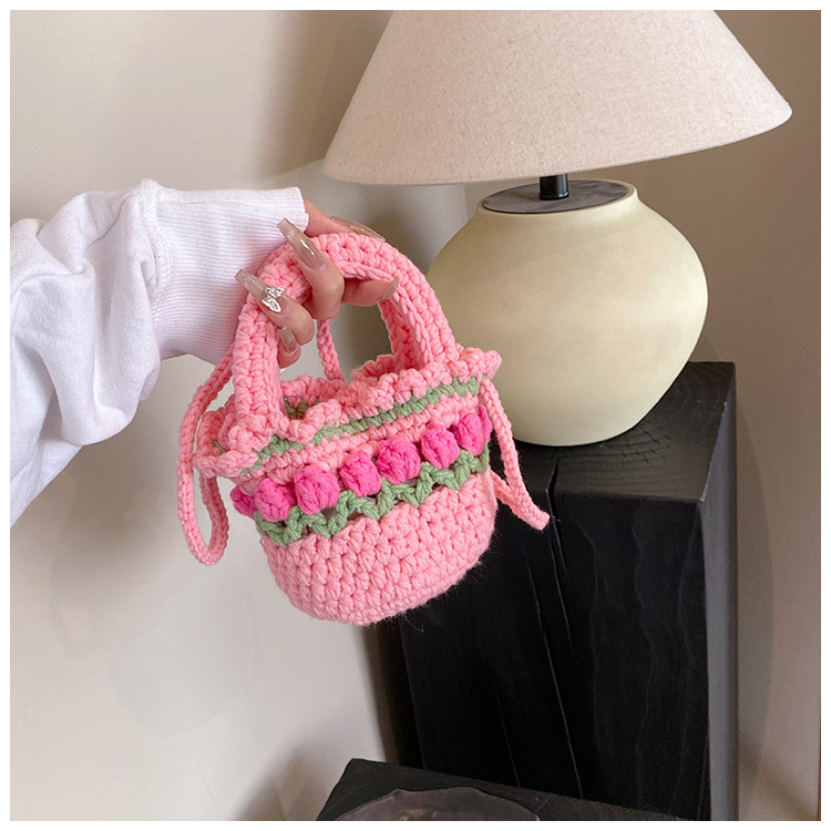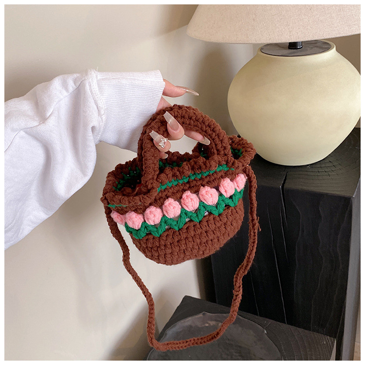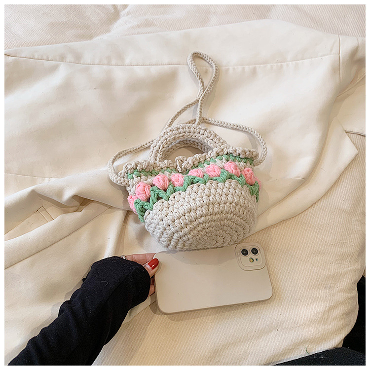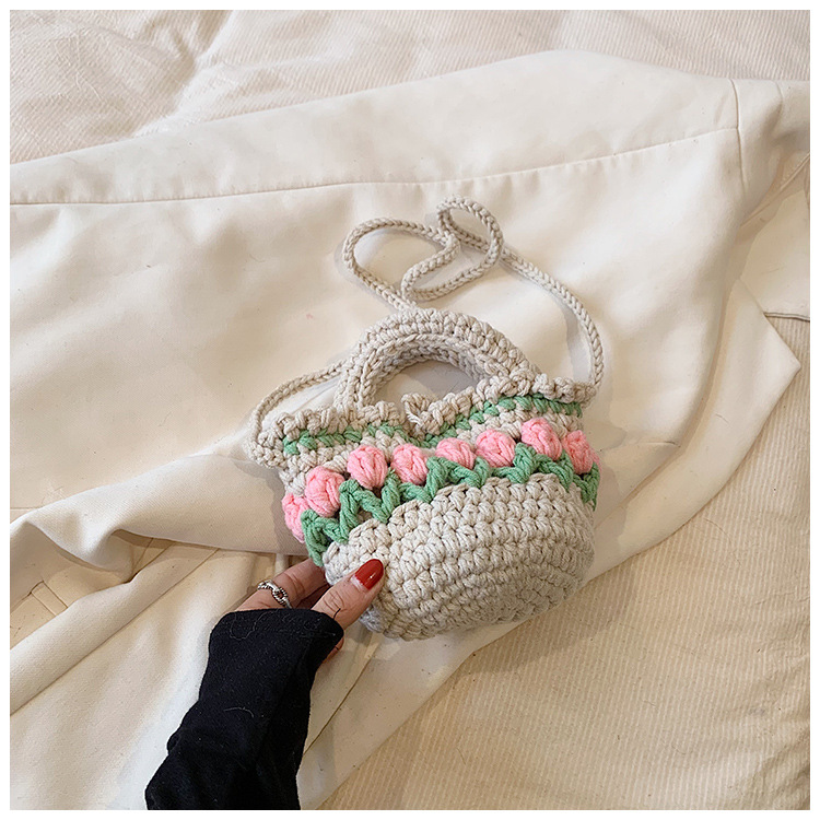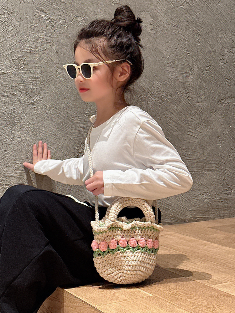 チューリップの花の手提げの子供の小さい包みの王女の毛糸はかわいい新型の女の子の肩の野菜のかごの包みを編みます。