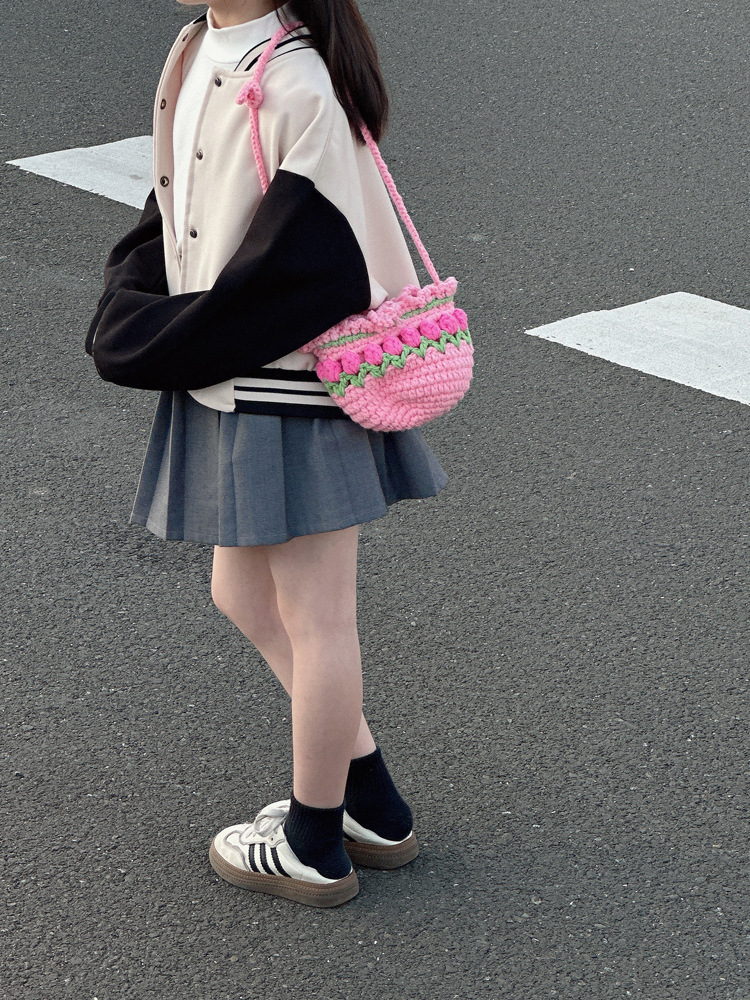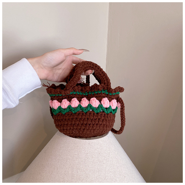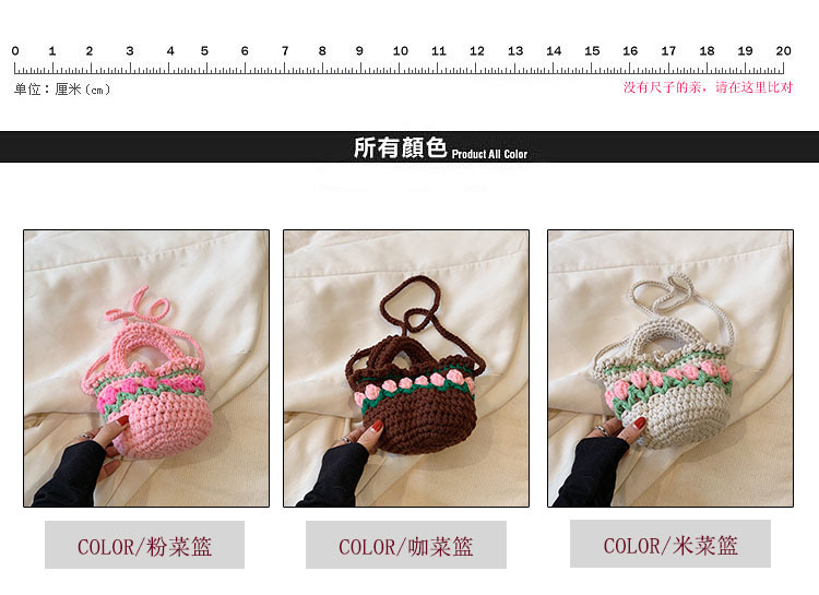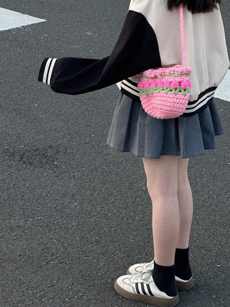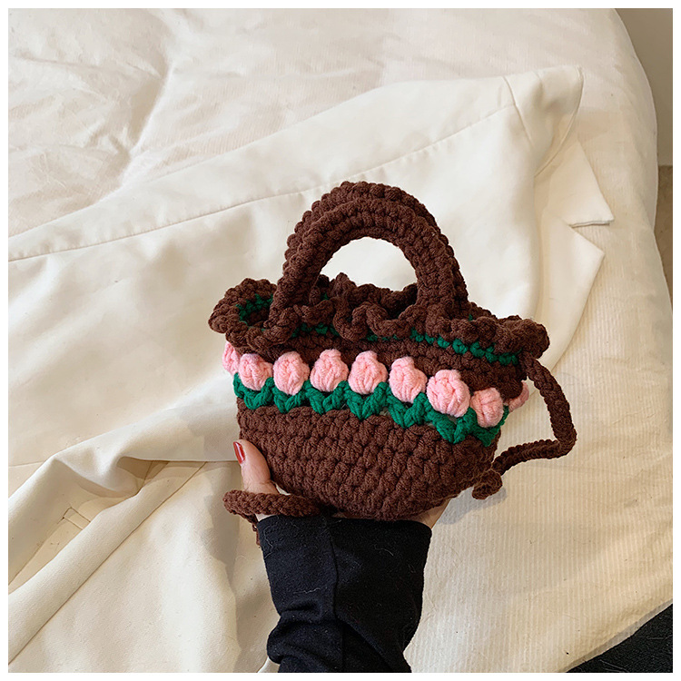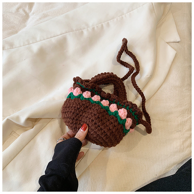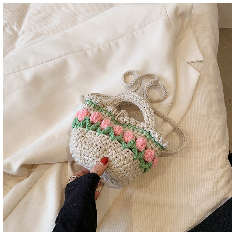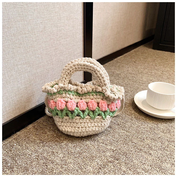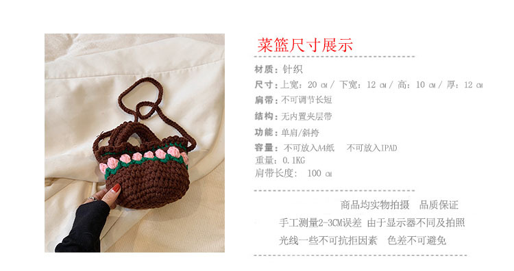 チューリップの花の手提げの子供の小さい包みの王女の毛糸はかわいい新型の女の子の肩の野菜のかごの包みを編みます。