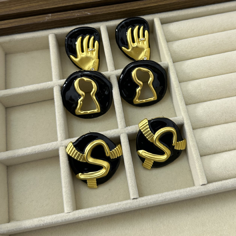フランスのレトロな大衆のデザインのロック穴の手のひらのアルファベットのエナメルの黒い金のイヤリングの独特な軽くて豪華な高級感のピアスの女性