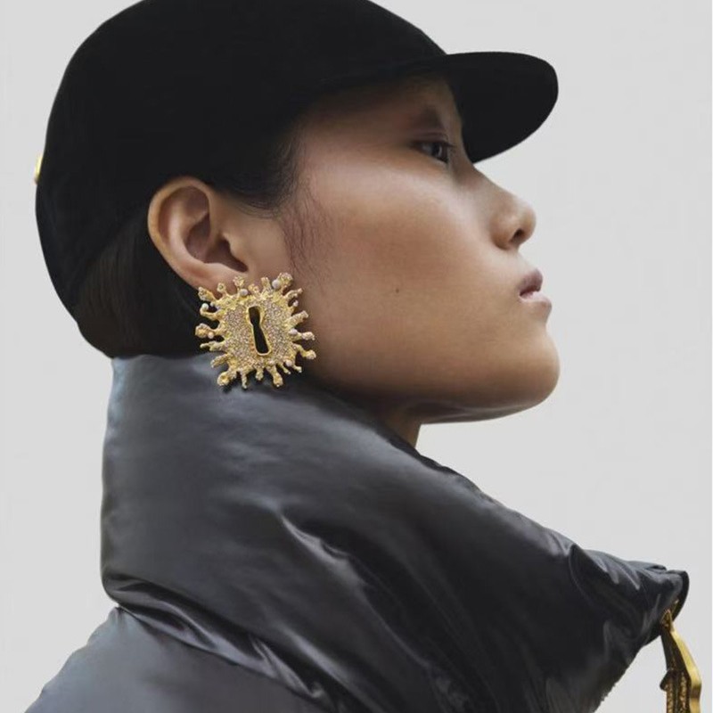 フランス式パリ風軽豪華高級感角型爆裂ロック穴真珠フラッシュイヤリング個性誇張気質ピアス
