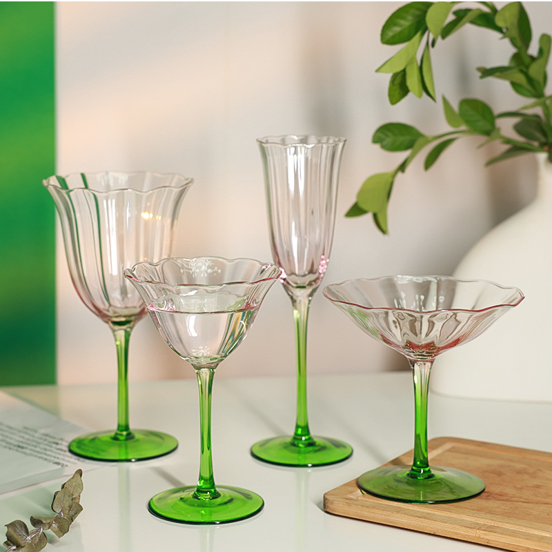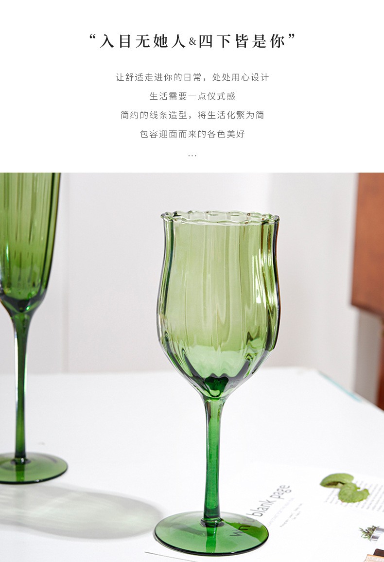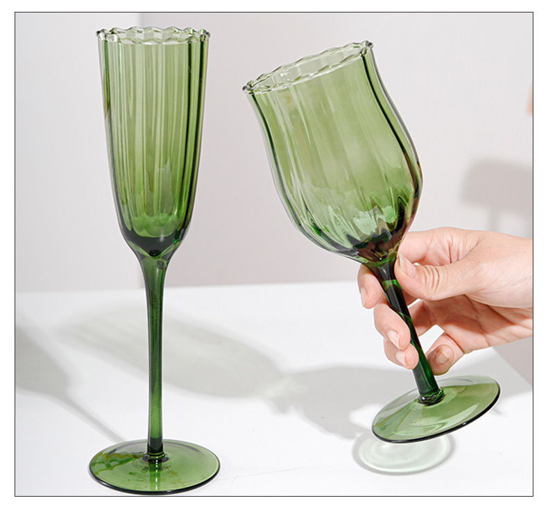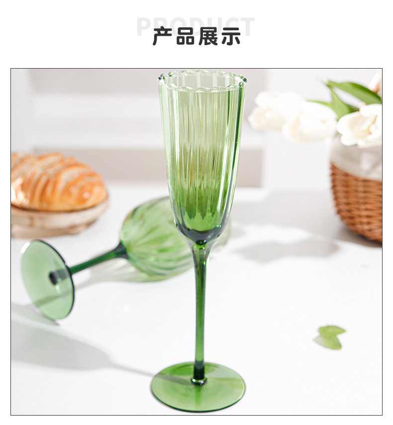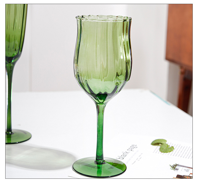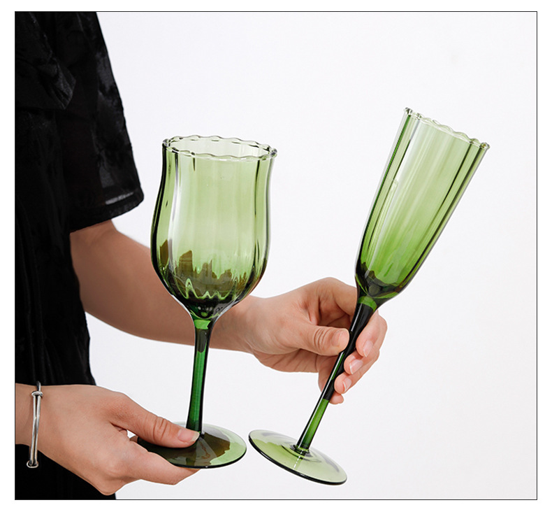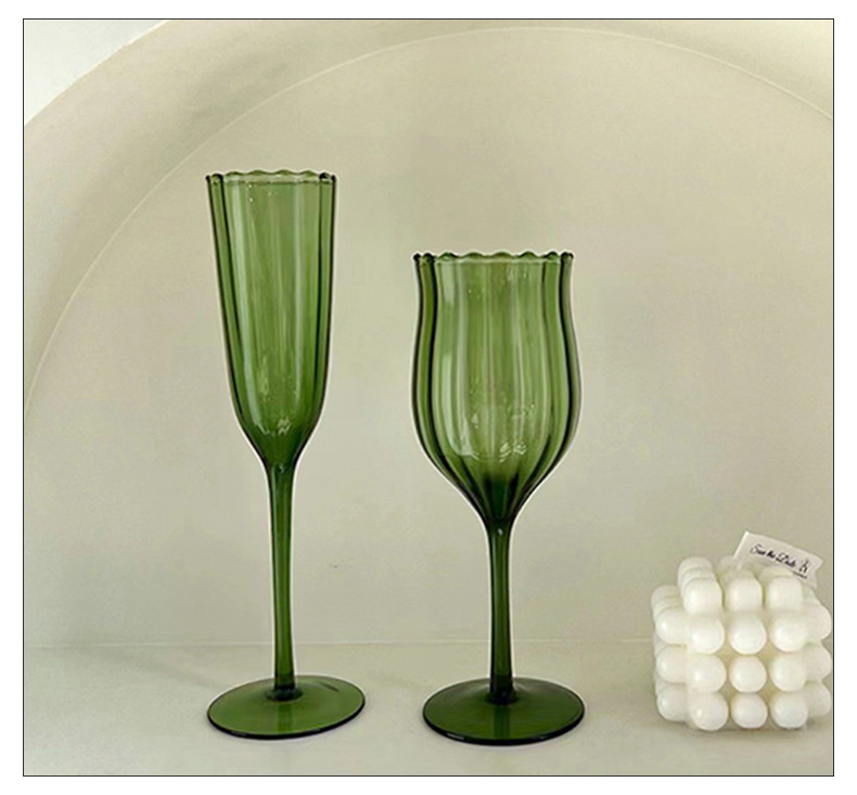 フランス無鉛ガラスシャンパングリーン高足カップ復古風花びらグラス軽贅沢レース口紅グラス卸売り
