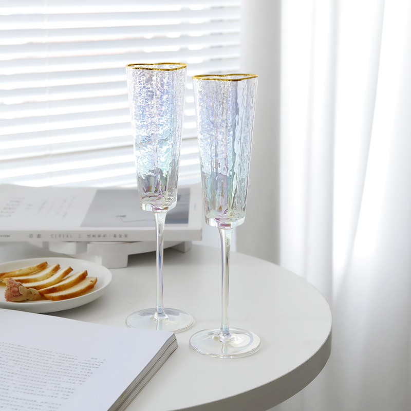 国境を越えた卸売り北欧の軽い贅沢な金の縁のハンマーの紋様の水晶のガラスのシャンパンの杯の高い顔の値は金の辺の桃の心の高足の杯を描きます。