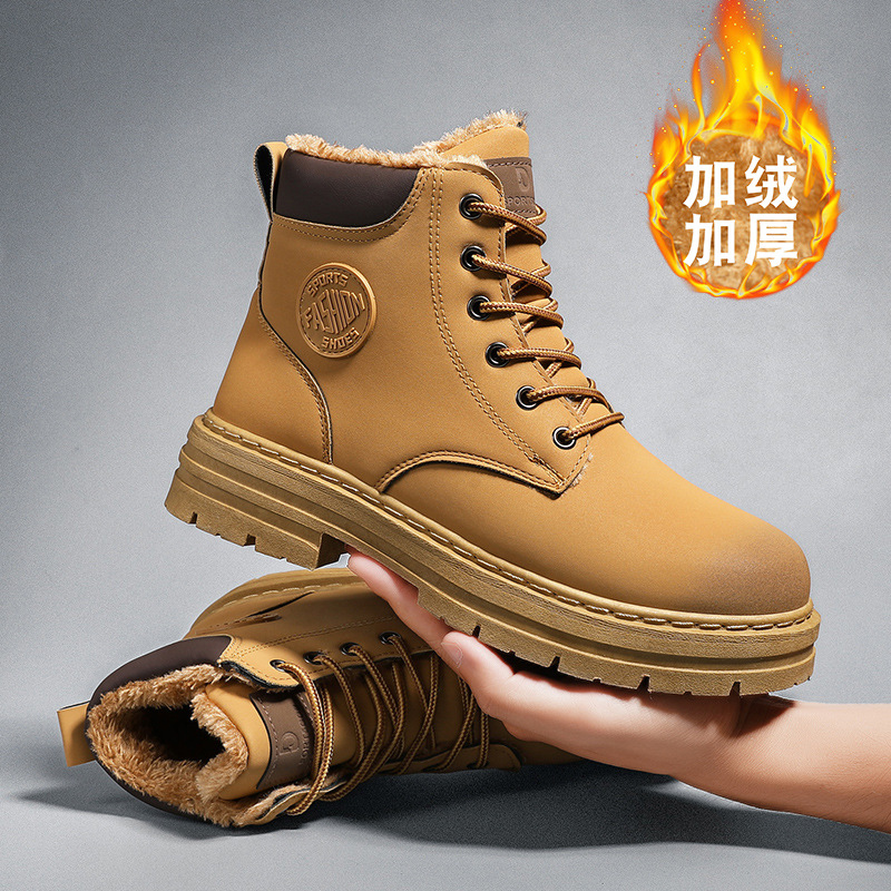 メンズウィンターハイカットワークブーツ、英国風マーティンブーツ、裏起毛、韓国風、多用途、アウトドア、イエローブーツ、トレンドシューズ