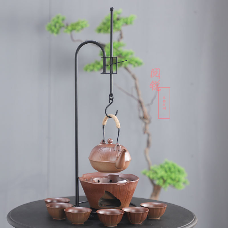 阅锐 回転式炭火茶炉 吊り下げ式湯沸かし炭火コンロ 提梁式ティーポット 茶室用ティーポットセット フルセット 鉄製自在勾炉