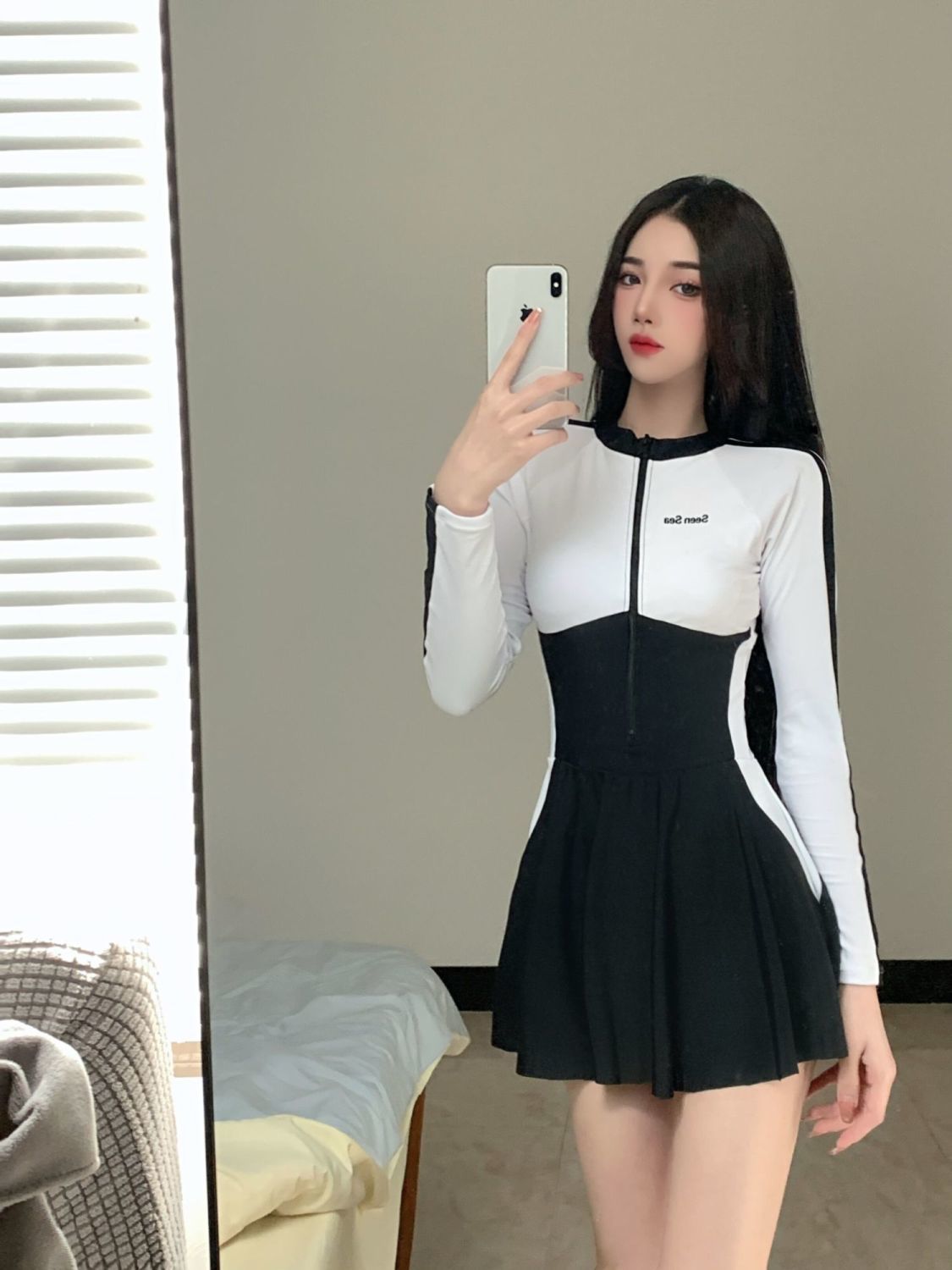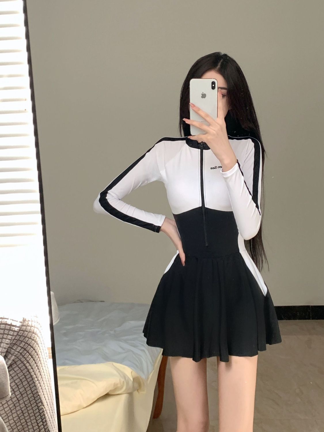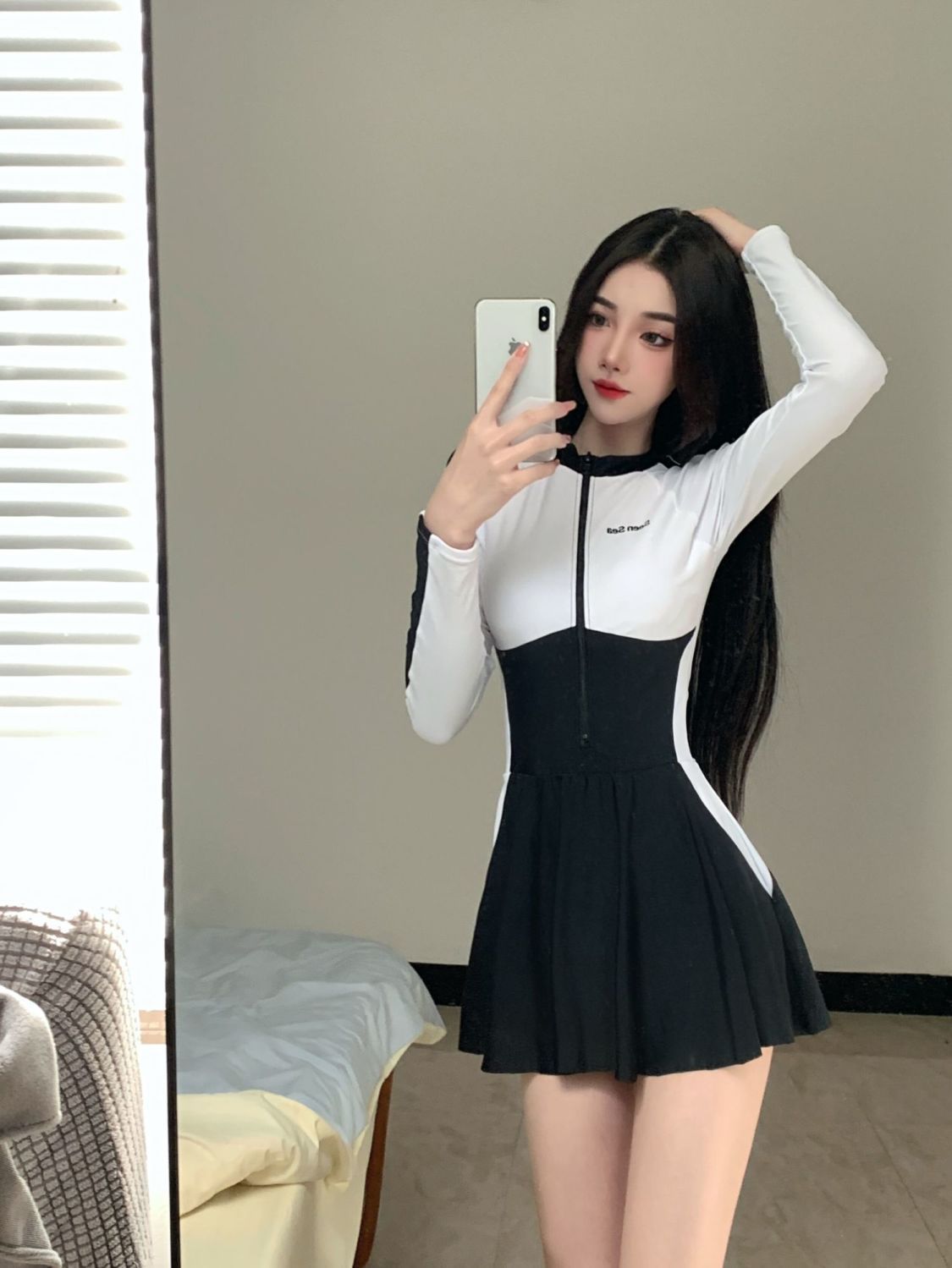TOSWIMスプリット水着の下に女性の長袖の日焼け止めがあります。
