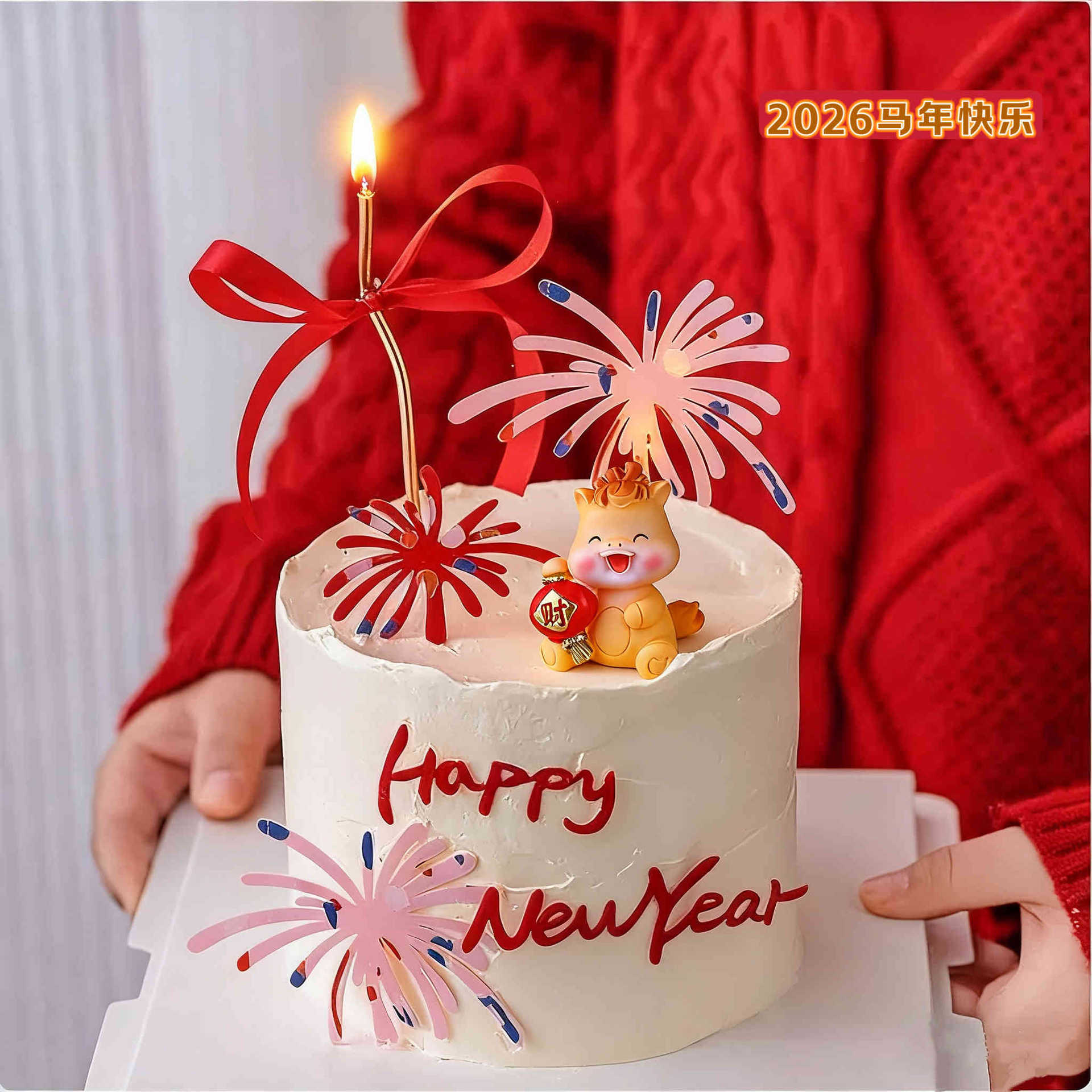 2026新年快乐蛋糕装饰马宝宝元旦跨年春节摆件亚克力礼花火花插牌