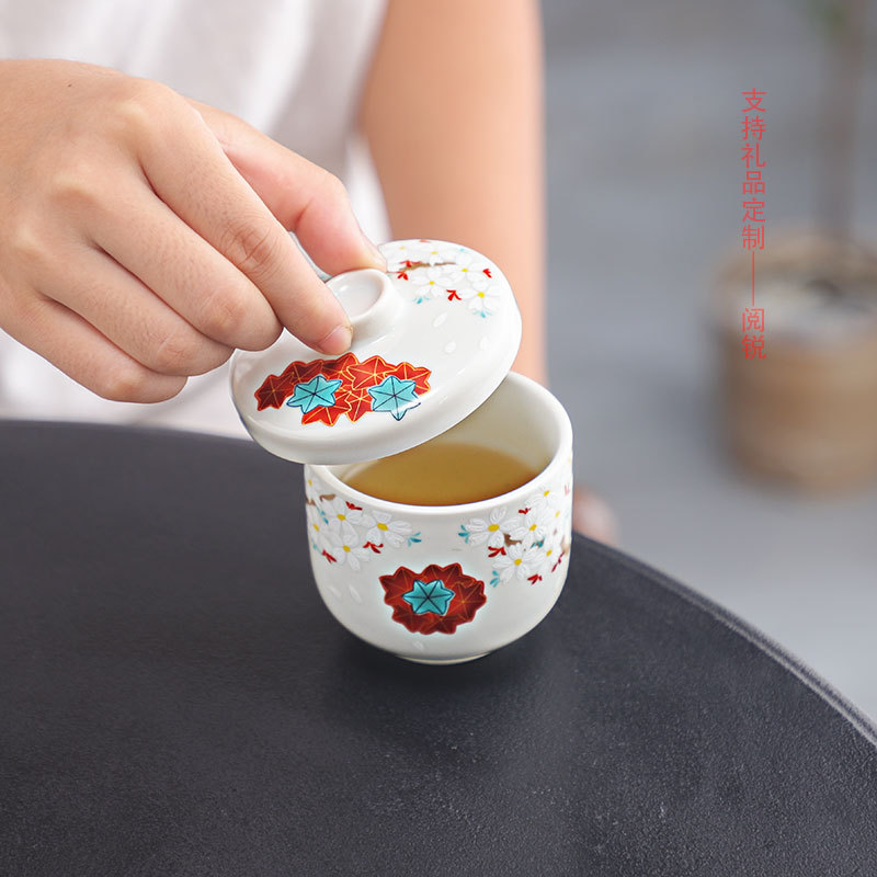 日本式創意蓋付きティーカップの小さいサイズのカエデの葉の形の家庭用陶磁器の食器の卵は銀の耳の茶器のプーアルのティーカップを担当します。