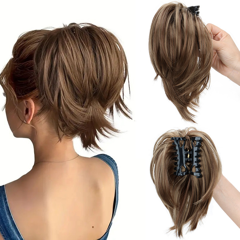 国境を越えた欧米のかつらのポニーテールの短いカールの半分は滝を刺して自然なサメを捕まえてポニーテールを挟みます。