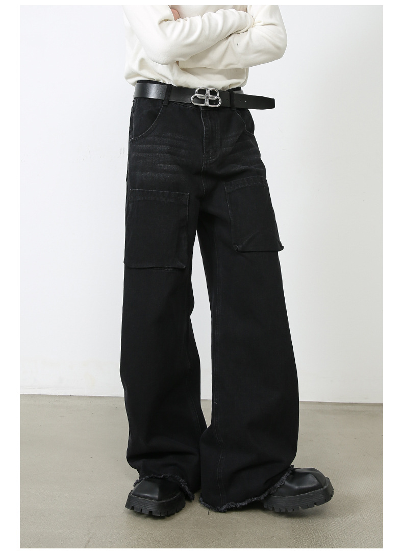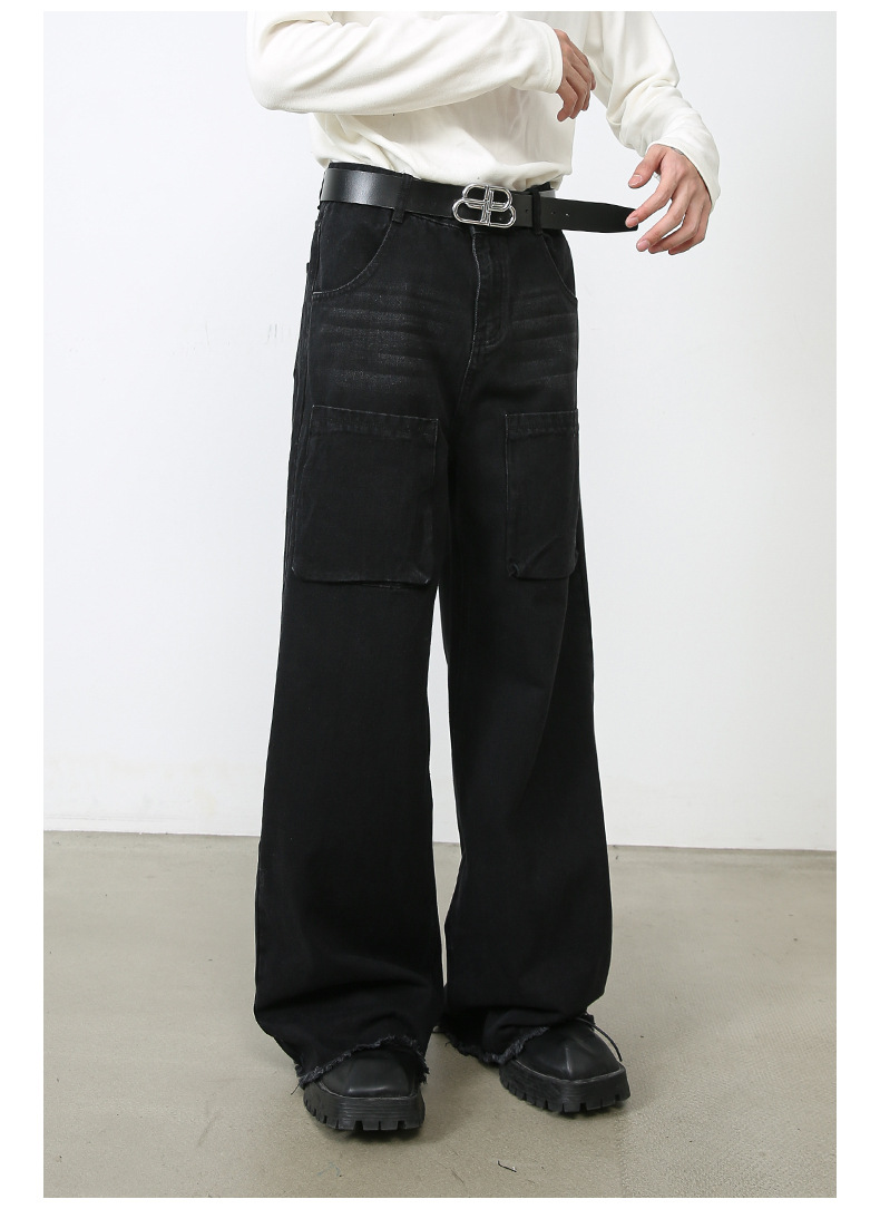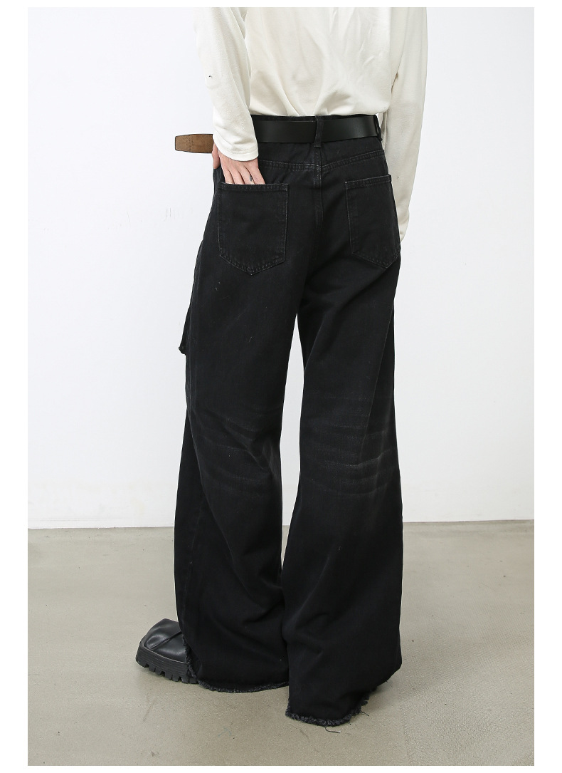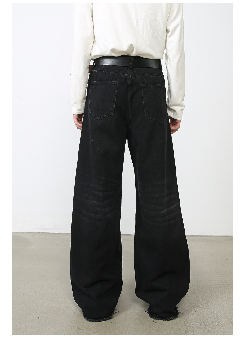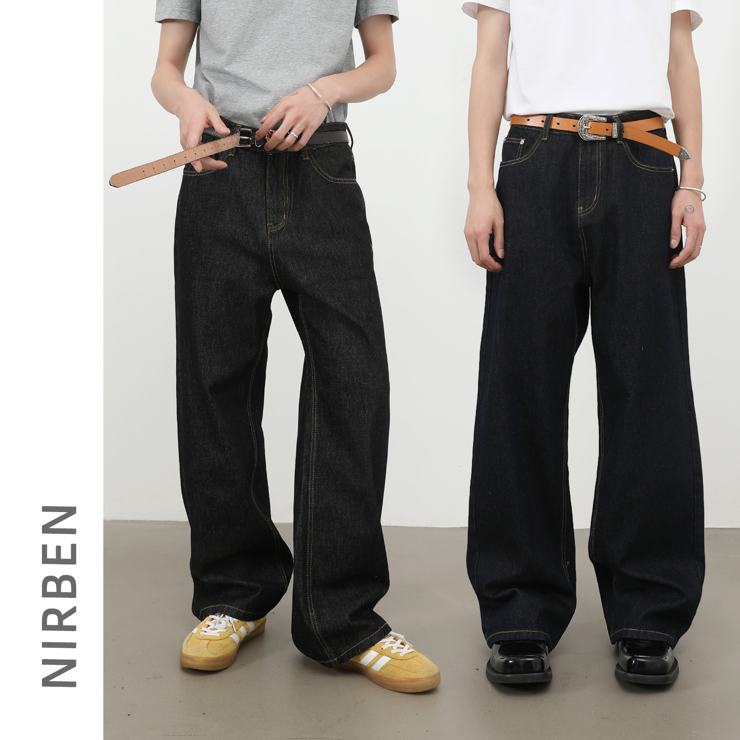 nirben牛仔|复古黑蓝丹宁原色阔腿牛仔裤男美式百搭直筒宽松长裤