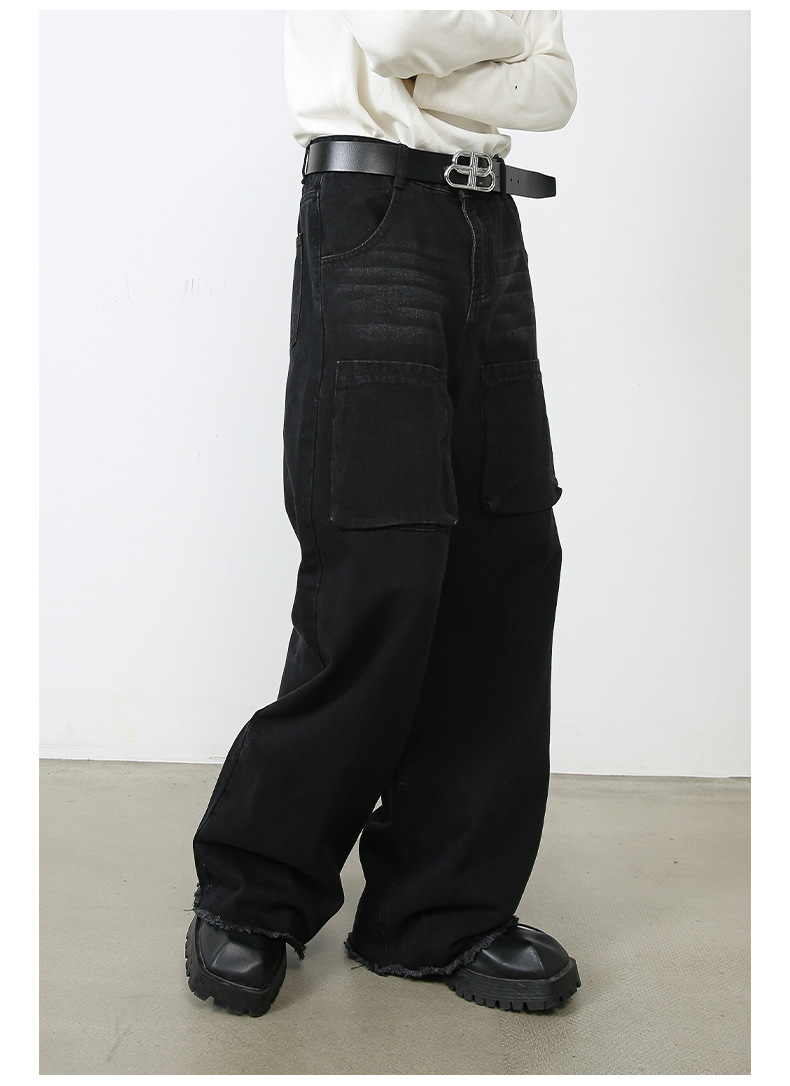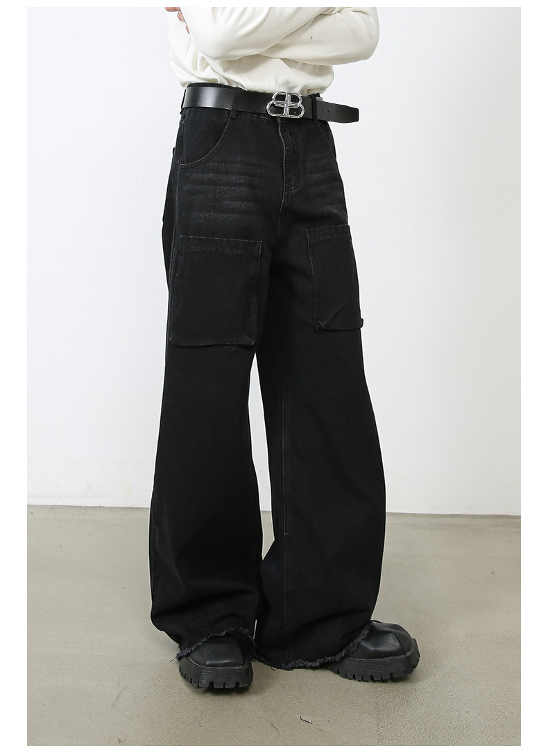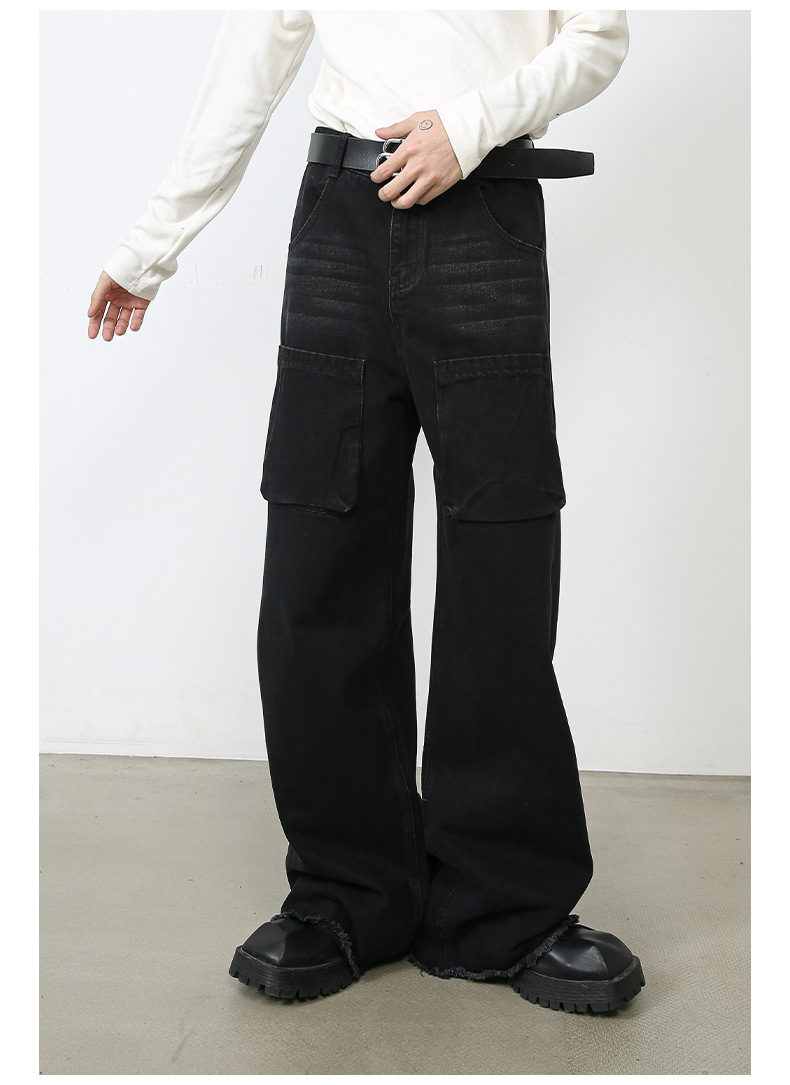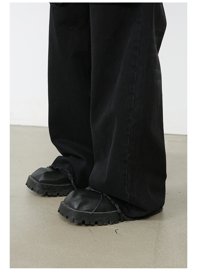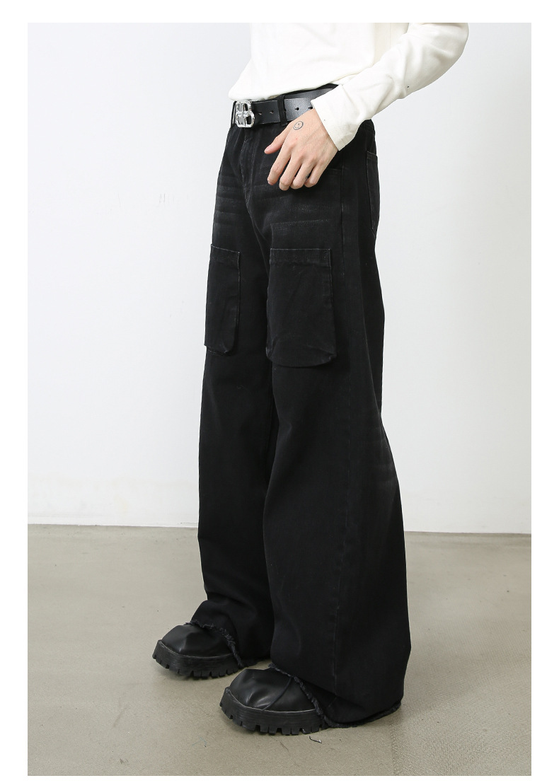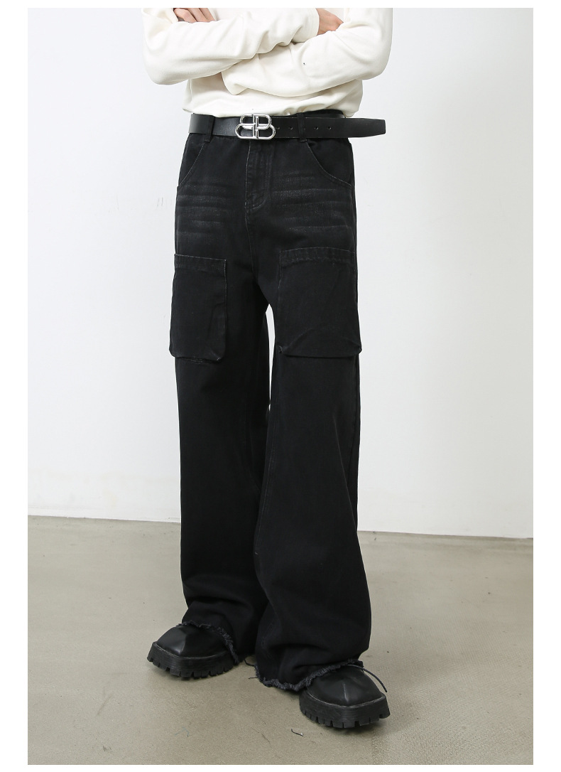 nirben牛仔|复古黑蓝丹宁原色阔腿牛仔裤男美式百搭直筒宽松长裤