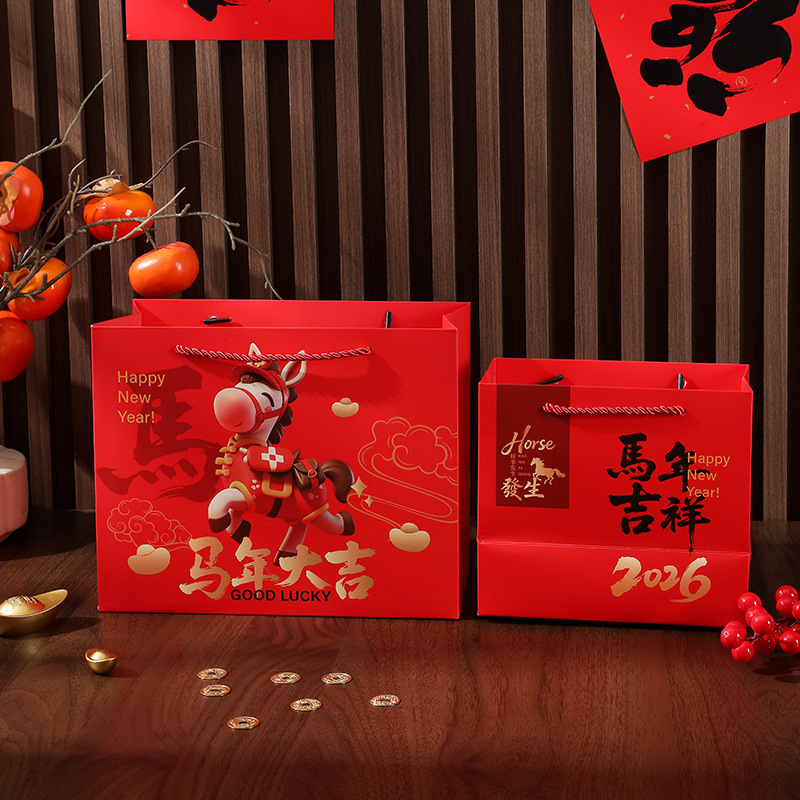 新年ギフトバッグ、お土産バッグ、馬年ハンドバッグ、中国風赤色包装袋、新年グッズ、元旦用万能ギフトバッグ