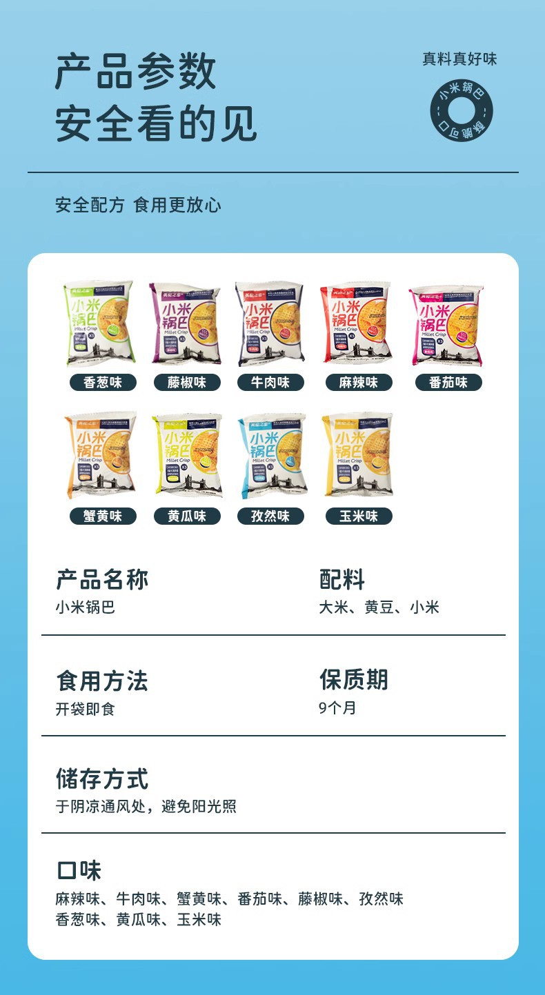 パッケージ仕様 小米鍋巴 ランダム味,キビクリスピーライス カニ卵味,キビクリスピーライススパイシー味,小米鍋巴 牛肉味,小米鍋巴トマト味,キビクリスピーライス キュウリ味,キビライス クミン風味,ライスクリスピーライス ラタンペッパー味,シャオミ クリスピーライス ネギ風味